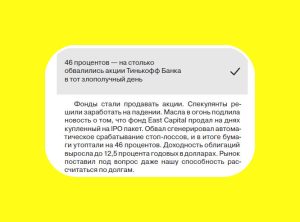 Правда, что вас уволили из Тинькофф из-за обвала акций? Вопрос задан здесь. ОТВЕТ: Ходил такой слух в среде журналистов. Слышал его, но забыл прокомментировать. Руки дошли через 12 лет после вашего вопроса. Это неправда, я уже фактически не работал в банке 15 ноября 2013 года, когда случились эти события. В этот день СМИ распространили информацию … Читать далее 15 ноября 2013 года. Паника с акциями Тинькофф (минус 46% за день)