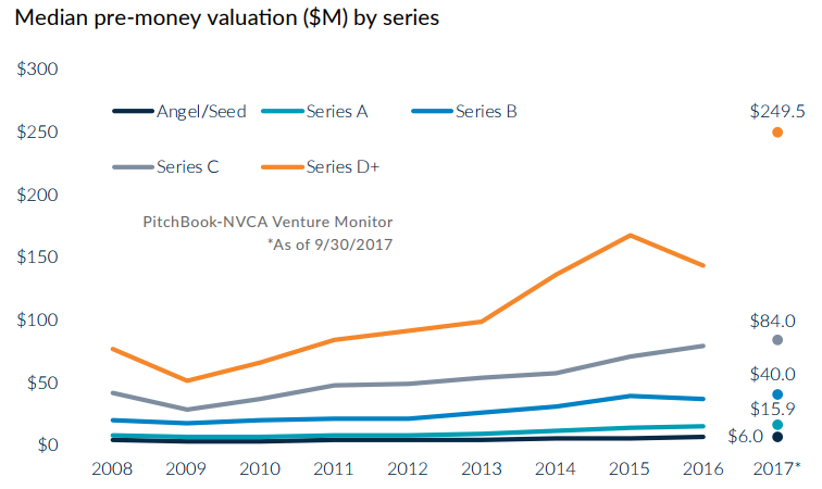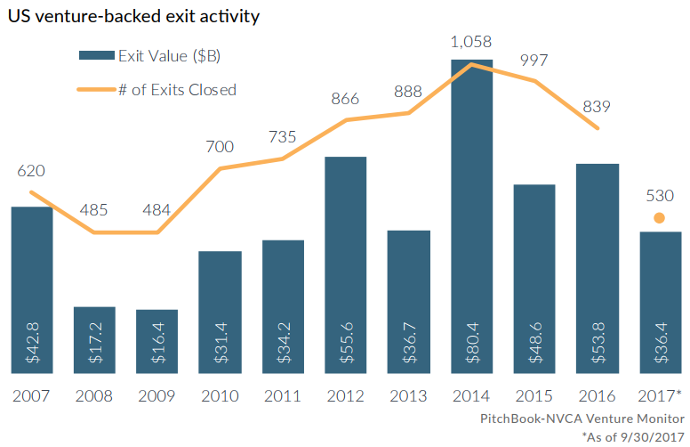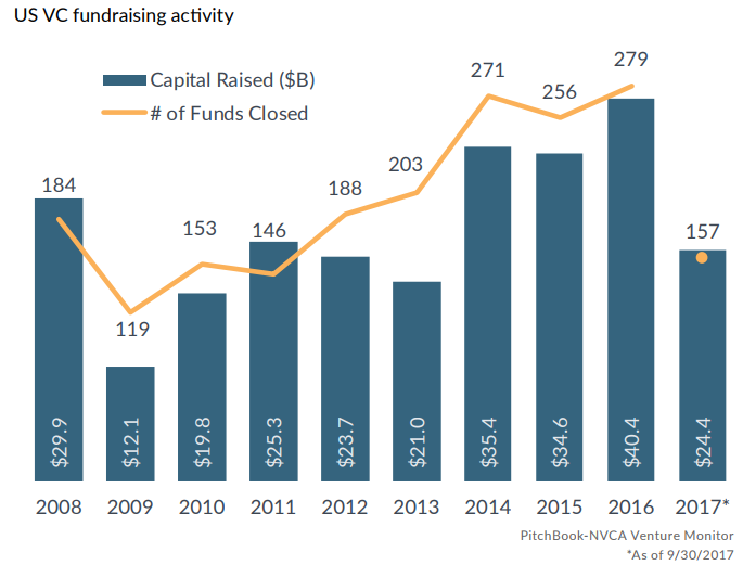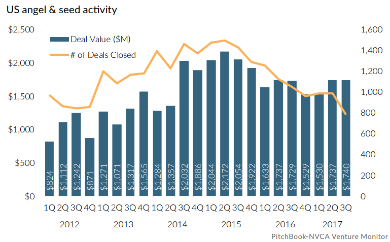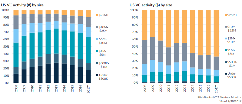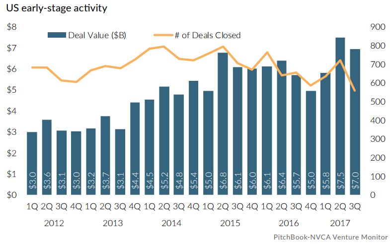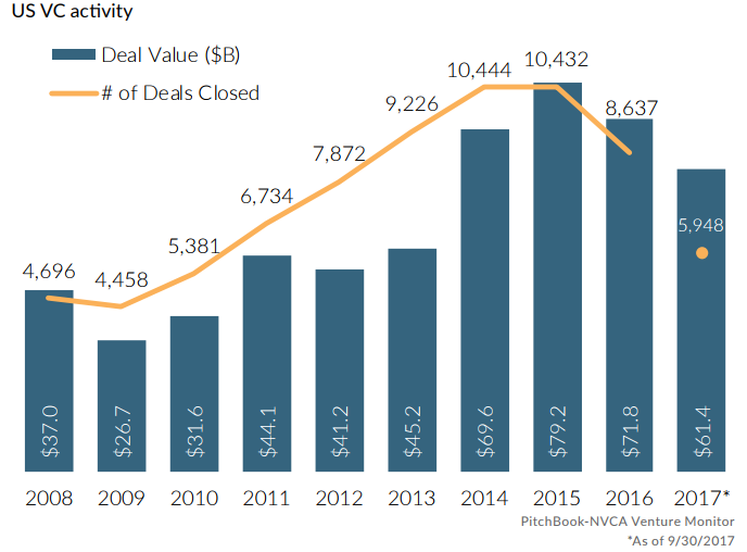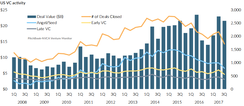30-страничный отчёт PitchBook-NVCA Venture Monitor заполнен визуальными представлениями и анализом того, что происходило в индустрии венчурного капитала США в третьем квартале 2017 года. Полный отчёт доступен для бесплатной загрузки (надо зарегистрироваться), но для быстрого просмотра отраслевых тенденций вот сборник ключевых диаграмм.