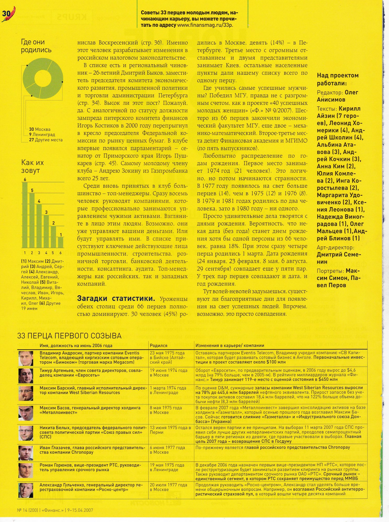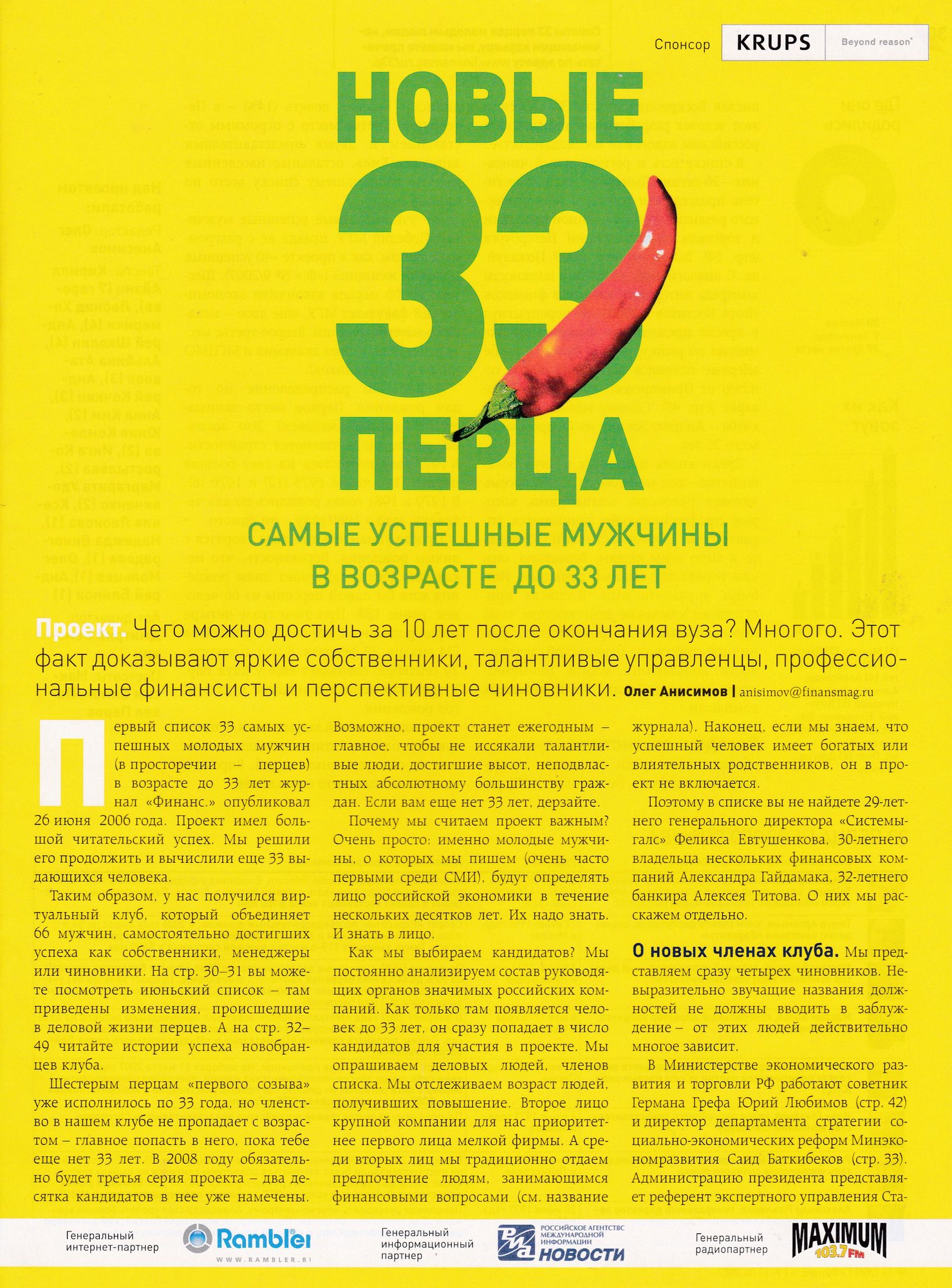 Первый список 33 самых успешных молодых мужчин (в просторечии – перцев) в возрасте до 33 лет журнал «Финанс.» опубликовал 26 июня 2006 года. Проект имел большой читательский успех. Мы решили его продолжить и вычислили еще 33 выдающихся человека.