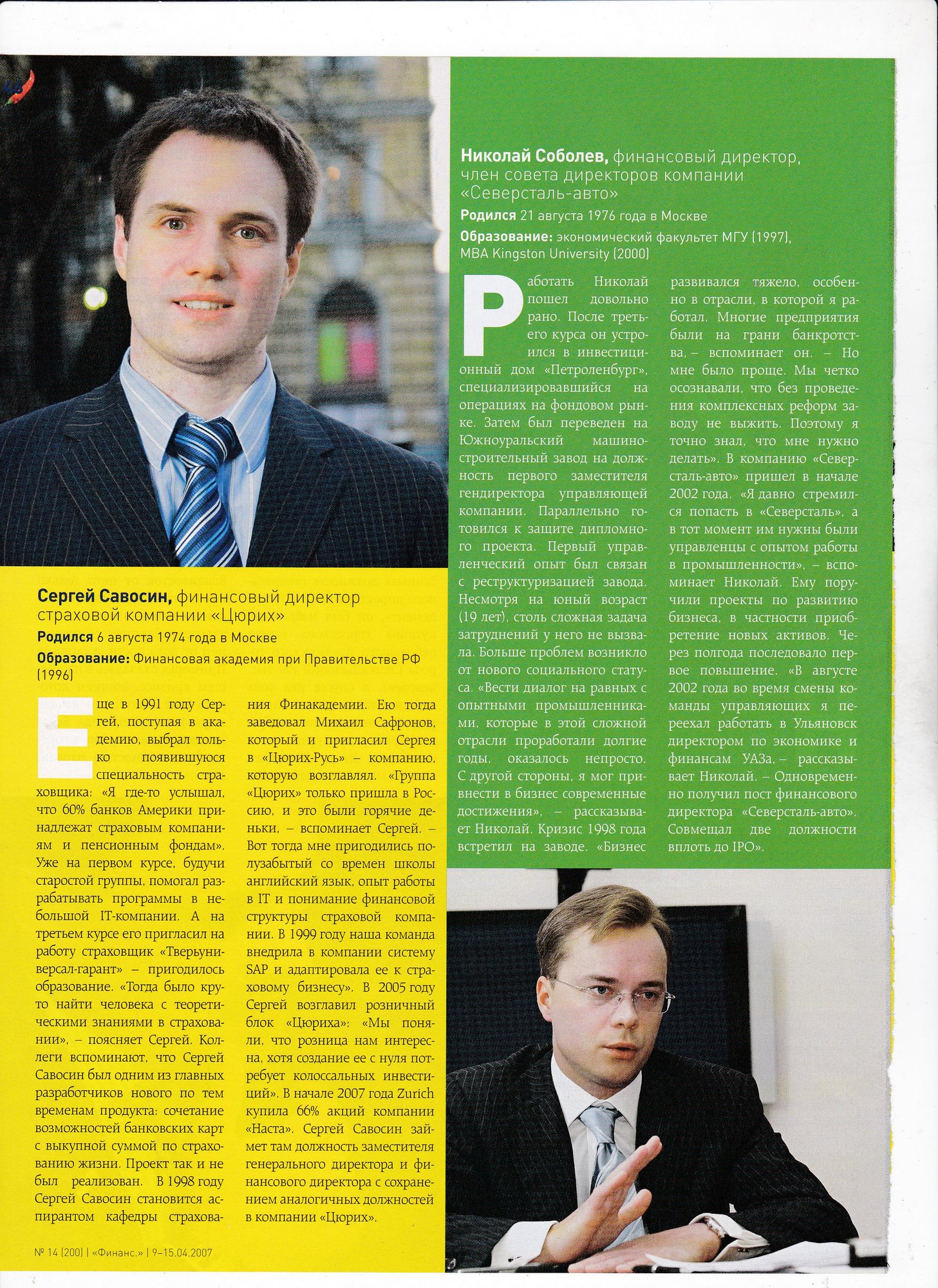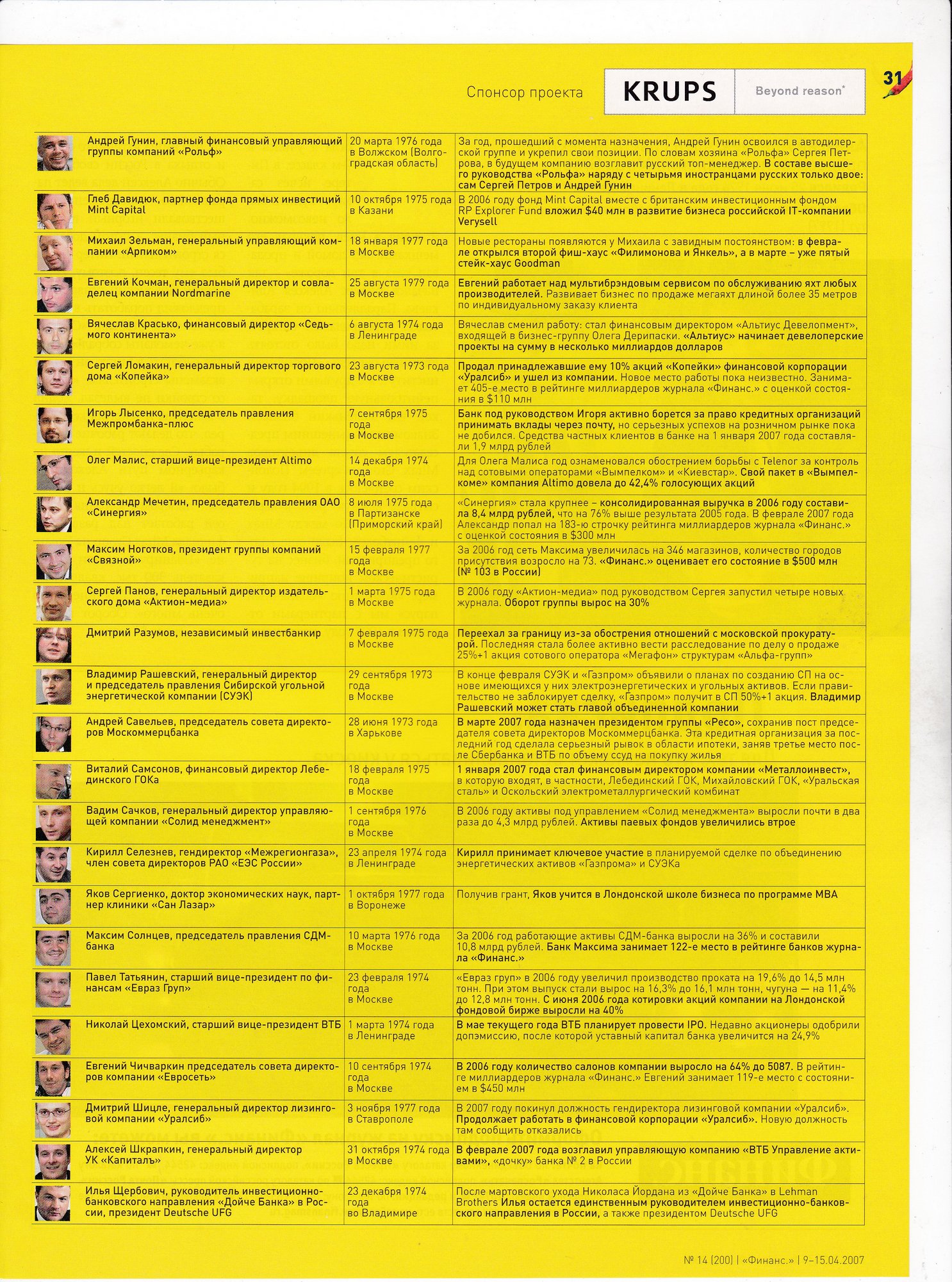 Как мы выбираем кандидатов? Мы постоянно анализируем состав руководящих органов значимых российских компаний. Как только там появляется человек до 33 лет, он сразу попадает в число кандидатов для участия в проекте. Мы опрашиваем деловых людей, членов списка. Мы отслеживаем возраст людей, получивших повышение. Второе лицо крупной компании для нас приоритетнее первого лица мелкой фирмы. А среди вторых лиц мы традиционно отдаем предпочтение людям, занимающимся финансовыми вопросами (см. название журнала). Наконец, если мы знаем, что успешный человек имеет богатых или влиятельных родственников, он в проект не включается.