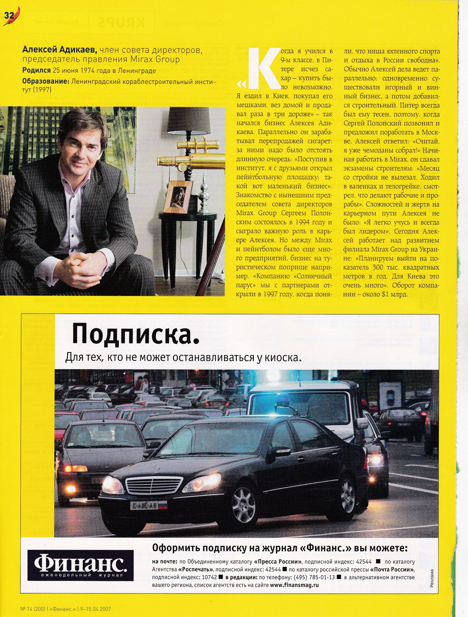Когда я учился в 9-м классе, в Питере исчез сахар – купить было невозможно. Я ездил в Киев, покупал его мешками, вез домой и продавал раза в три дороже» – так начался бизнес Алексея Адикаева. Параллельно он зарабатывал перепродажей сигарет: за ними надо было отстоять длинную очередь: «Поступив в институт, я с друзьями открыл пейнтбольную площадку: такой вот маленький бизнес». Знакомство с нынешним председателем совета директоров Mirax Group Сергеем Полонским состоялось в 1994 году и сыграло важную роль в карьере Алексея. Но между Mirax и пейнтболом было еще много предприятий, бизнес на туристическом поприще например. «Компанию «Солнечный парус» мы с партнерами открыли в 1997 году, когда поняли, что ниша яхтенного спорта и отдыха в России свободна». Обычно Алексей дела ведет параллельно: одновременно существовали игорный и винный бизнес, а потом добавился строительный. Питер всегда был ему тесен, поэтому, когда Сергей Полонский позвонил и предложил поработать в Москве, Алексей ответил: «Считай, я уже чемоданы собрал!» Начиная работать в Mirax, он сдавал экзамены строителям: «Месяц со стройки не вылезал. Ходил в валенках и телогрейке, смотрел, что делают рабочие и прорабы». Сложностей и жертв на карьерном пути Алексея не было: «Я легко учусь и всегда был лидером». Сегодня Алексей работает над развитием филиала Mirax Group на Украине: «Планируем выйти на показатель 300 тыс. квадратных метров в год. Для Киева это очень много». Оборот компании – около $1 млрд.