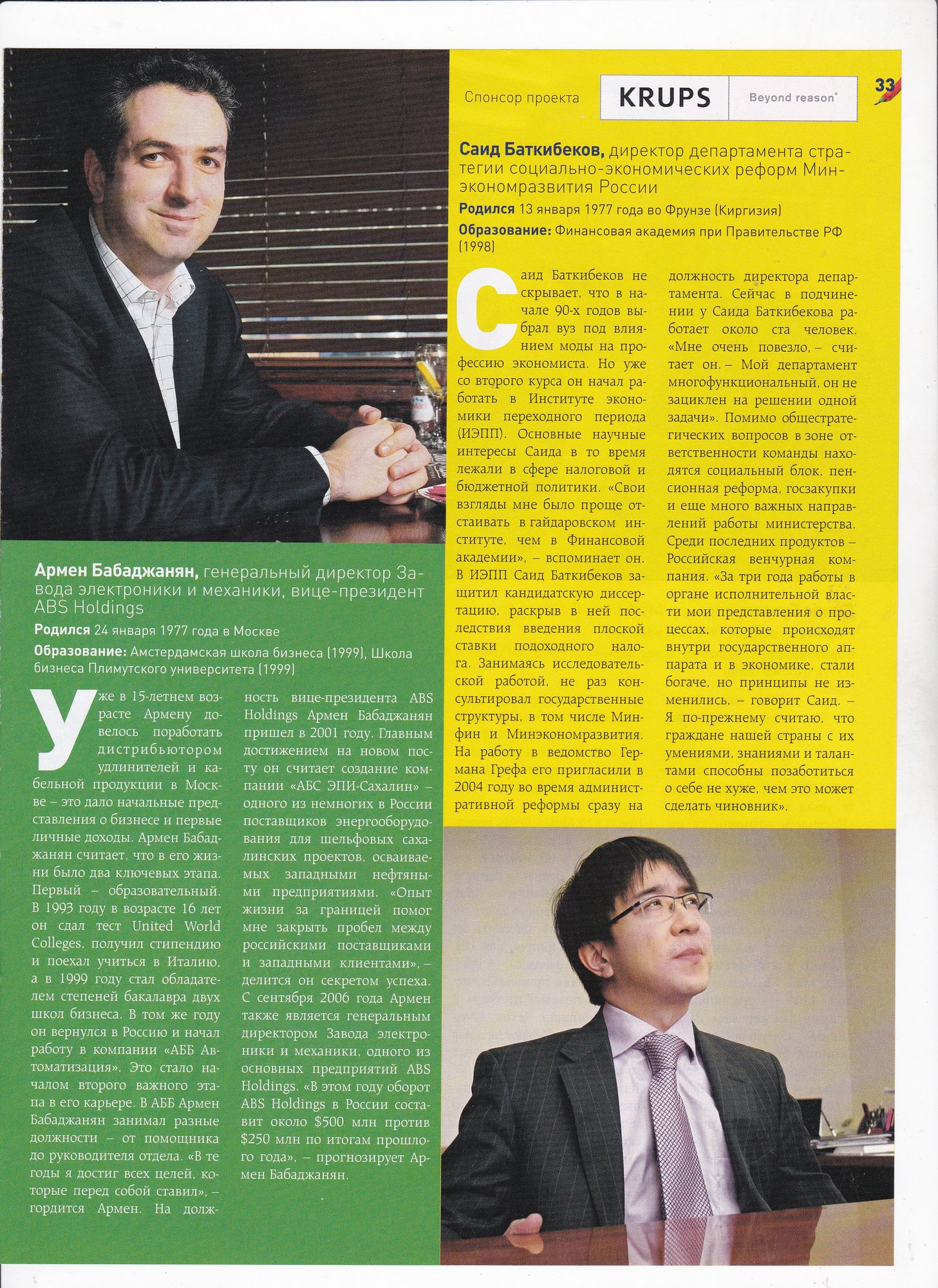 Уже в 15-летнем возрасте Армену довелось поработать дистрибьютором удлинителей и кабельной продукции в Москве – это дало начальные представления о бизнесе и первые личные доходы. Армен Бабаджанян считает, что в его жизни было два ключевых этапа. Первый – образовательный. В 1993 году в возрасте 16 лет он сдал тест United World Colleges, получил стипендию и поехал учиться в Италию, а в 1999 году стал обладателем степеней бакалавра двух школ бизнеса. В том же году он вернулся в Россию и начал работу в компании «АББ Автоматизация». Это стало началом второго важного этапа в его карьере. В АББ Армен Бабаджанян занимал разные должности – от помощника до руководителя отдела. «В те годы я достиг всех целей, которые перед собой ставил», – гордится Армен. На должность вице-президента ABS Holdings Армен Бабаджанян пришел в 2001 году. Главным достижением на новом посту он считает создание компании «АБС ЭПИ-Сахалин» – одного из немногих в России поставщиков энергооборудования для шельфовых сахалинских проектов, осваиваемых западными нефтяными предприятиями. «Опыт жизни за границей помог мне закрыть пробел между российскими поставщиками и западными клиентами», – делится он секретом успеха. С сентября 2006 года Армен также является генеральным директором Завода электроники и механики, одного из основных предприятий ABS Holdings. «В этом году оборот ABS Holdings в России составит около $500 млн против $250 млн по итогам прошлого года», – прогнозирует Армен Бабаджанян.