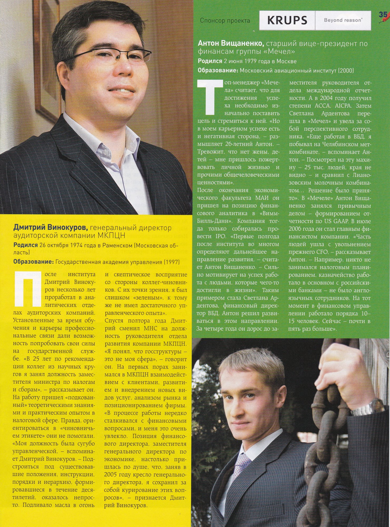 После окончания экономического факультета МАИ он пришел на позицию финансового аналитика в «Вимм-Билль-Данн». Компания тогда только собиралась провести IPO. «Первые полгода после института во многом определяют дальнейшее направление развития, – считает Антон Вищаненко. – Сильно мотивирует на успех работа с людьми, которые чего-то достигли в жизни». Таким примером стала Светлана Ардентова, финансовый директор ВБД. Антон решил развиваться в этом направлении. За четыре года он дорос до заместителя руководителя отдела международной отчетности. А в 2004 году получил степени ACCA, AICPA. Затем Светлана Ардентова перешла в «Мечел» и увела за собой перспективного сотрудника. «Еще работая в ВБД, я побывал на Челябинском меткомбинате, – вспоминает Антон. – Посмотрел на эту махину – 25 тыс. людей, края не видно – и сравнил с Лианозовским молочным комбинатом… Решение было принято». В «Мечеле» Антон Вищаненко занялся привычным делом – формированием отчетности по US GAAP. В июле 2006 года он стал главным финансистом компании. «Часть людей ушла с увольнением прежнего CFO, – рассказывает Антон. – Например, никто не занимался налоговым планированием, казначейство работало в основном с российскими банками – не было англоязычных сотрудников. На тот момент в финансовом управлении работало порядка 10–15 человек. Сейчас – почти в пять раз больше».