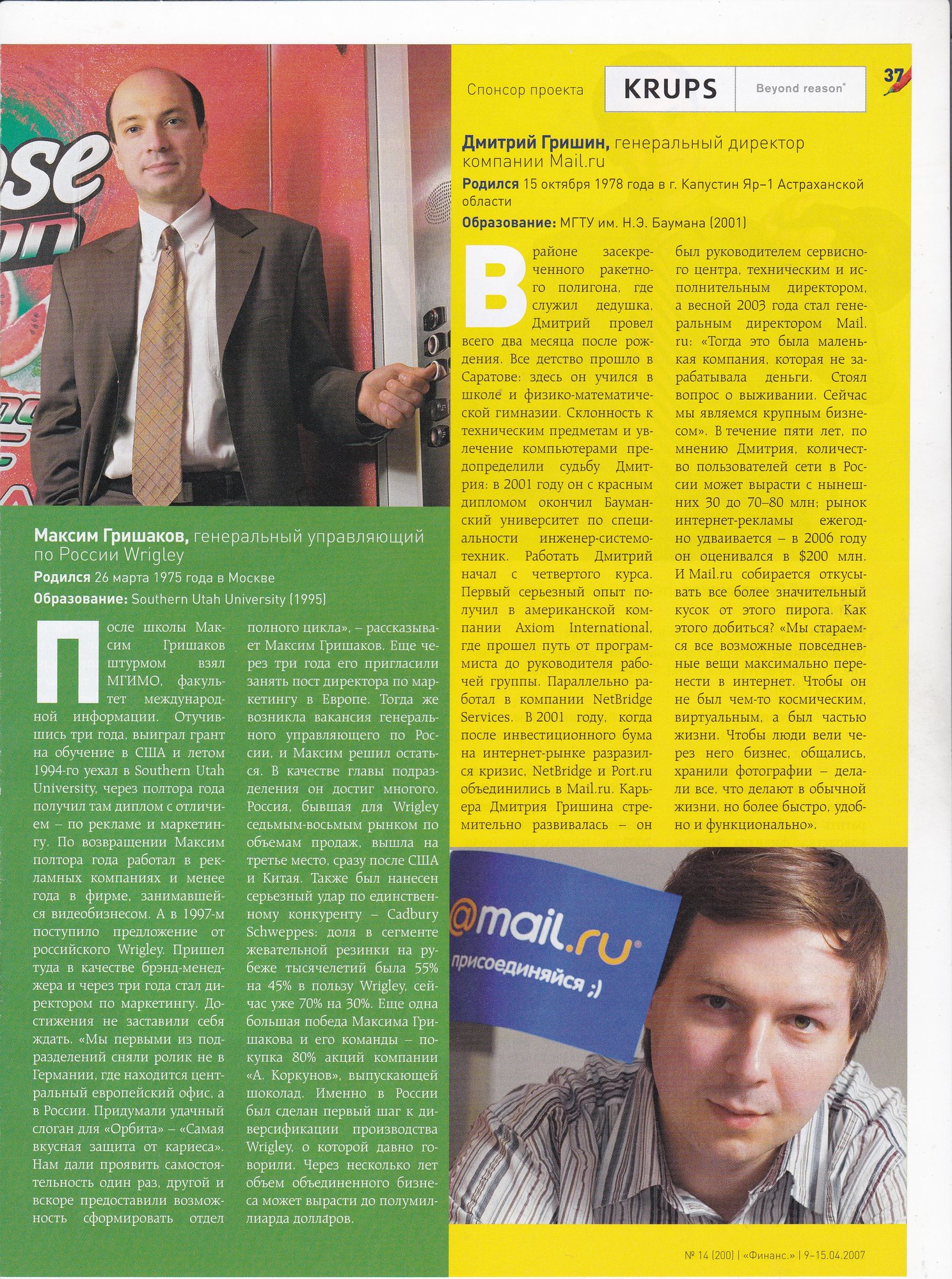 После школы Максим Гришаков штурмом взял МГИМО, факультет международной информации. Отучившись три года, выиграл грант на обучение в США и летом 1994-го уехал в Southern Utah University, через полтора года получил там диплом с отличием – по рекламе и маркетингу. По возвращении Максим полтора года работал в рекламных компаниях и менее года в фирме, занимавшейся видеобизнесом. А в 1997-м поступило предложение от российского Wrigley. Пришел туда в качестве брэнд-менеджера и через три года стал директором по маркетингу. Достижения не заставили себя ждать. «Мы первыми из подразделений сняли ролик не в Германии, где находится центральный европейский офис, а в России. Придумали удачный слоган для «Орбита» – «Самая вкусная защита от кариеса». Нам дали проявить самостоятельность один раз, другой и вскоре предоставили возможность сформировать отдел полного цикла», – рассказывает Максим Гришаков. Еще через три года его пригласили занять пост директора по маркетингу в Европе. Тогда же возникла вакансия генерального управляющего по России, и Максим решил остаться. В качестве главы подразделения он достиг многого. Россия, бывшая для Wrigley седьмым-восьмым рынком по объемам продаж, вышла на третье место, сразу после США и Китая. Также был нанесен серьезный удар по единственному конкуренту – Cadbury Schweppes: доля в сегменте жевательной резинки на рубеже тысячелетий была 55% на 45% в пользу Wrigley, сейчас уже 70% на 30%. Еще одна большая победа Максима Гришакова и его команды – покупка 80% акций компании «А. Коркунов», выпускающей шоколад. Именно в России был сделан первый шаг к диверсификации производства Wrigley, о которой давно говорили. Через несколько лет объем объединенного бизнеса может вырасти до полумиллиарда долларов.