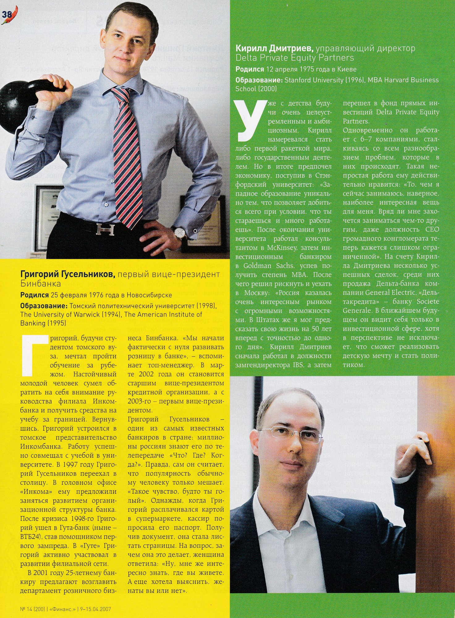 Одновременно он работает с 6–7 компаниями, сталкиваясь со всем разнообразием проблем, которые в них происходят. Такая непростая работа ему действительно нравится: «То, чем я сейчас занимаюсь, наверное, наиболее интересная вещь для меня. Вряд ли мне захочется заниматься чем-то другим, даже должность CEO громадного конгломерата теперь кажется слишком ограниченной». На счету Кирилла Дмитриева несколько успешных сделок, среди них продажа Дельта-банка компании General Electric, «Дельтакредита» – банку Societe Generale. В ближайшем будущем он видит себя только в инвестиционной сфере, хотя в перспективе не исключает, что сможет реализовать детскую мечту и стать политиком.