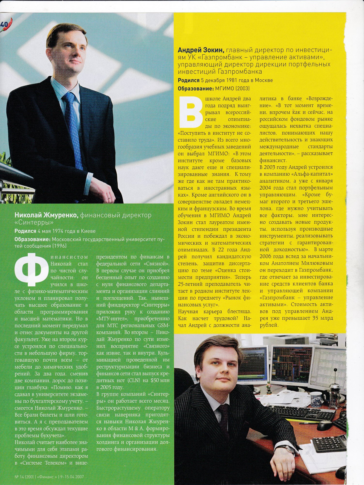 В группе компаний «Синтерры» он работает всего месяц. Быстрорастущему оператору связи наверняка пригодятся навыки Николая Жмуренко в области M & A, формирования финансовой структуры холдинга и организации долгового финансирования.