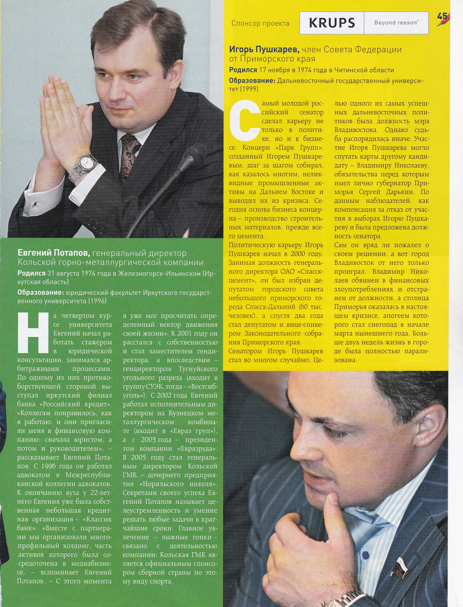 В списке есть и региональный чиновник – 26-летний Дмитрий Быков, заместитель председателя комитета экономического развития, промышленной политики и торговли администрации Петербурга (стр. 34). Высок ли этот пост? Пожалуй, да. С аналогичной по статусу должности зампреда питерского комитета финансов Игорь Костиков в 2000 году перепрыгнул в кресло председателя Федеральной комиссии по рынку ценных бумаг. В клубе впервые появился парламентарий – сенатор от Приморского края Игорь Пушкарев (стр. 45). Самому молодому члену клуба – Андрею Зокину из Газпромбанка всего 25 лет.