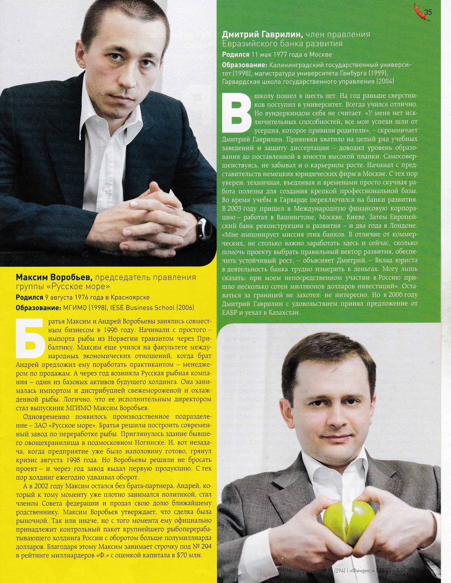Братья Максим и Андрей Воробьевы занялись совместным бизнесом в 1996 году. Начинали с простого – импорта рыбы из Норвегии транзитом через Прибалтику. Максим еще учился на факультете международных экономических отношений, когда брат Андрей предложил ему поработать практикантом – менеджером по продажам. А через год возникла Русская рыбная компания – один из базовых активов будущего холдинга. Она занималась импортом и дистрибуцией свежемороженой и охлажденной рыбы. Логично, что ее исполнительным директором стал выпускник МГИМО Максим Воробьев.