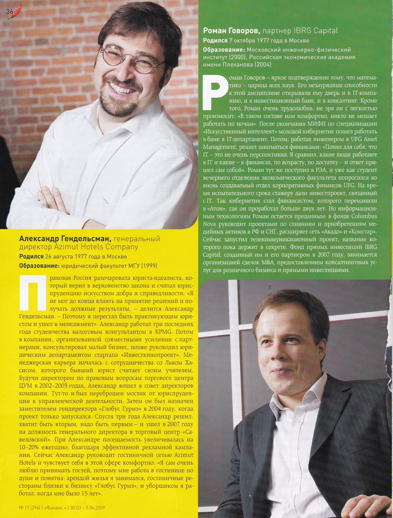 Роман Говоров – яркое подтверждение тому, что математика – царица всех наук. Его незаурядные способности к этой дисциплине открывали ему дверь и в IT-компанию, и в инвестиционный банк, и в консалтинг. Кроме того, Роман очень трудолюбив, не зря он с легкостью произносит: «В таком составе нам комфортно, никто не мешает работать по ночам». После окончания МИФИ по специализации «Искусственный интеллект» молодой кибернетик пошел работать в банк в IT-департамент. Потом, работая инженером в UFG, решил заниматься финансами: «Понял для себя, что IT – это не очень перспективно. Я сравнил, какие люди работают в IT и какие – в финансах, по возрасту, по достатку – и ответ пришел сам собой». Роман тут же поступил в РЭА, и уже как студент вечернего отделения экономического факультета попросился во вновь создаваемый отдел корпоративных финансов UFG. На время испытательного срока стажеру дали инвестпроект, связанный с IT. Так кибернетик стал финансистом, которого переманили в «Атон», где он проработал больше двух лет. Но информационным технологиям Роман остается преданным: в фонде Columbus Nova руководит проектами по слияниям и приобретениям медийных активов в РФ и СНГ, расширяет сеть «Акадо» и «Комкор». Сейчас запустил телекоммуникационный проект, название которого пока держит в секрете. Фонд прямых инвестиций IBRG Capital, созданный им и его партнером в 2007 году, занимается организацией сделок M&A, предоставлением консалтинговых услуг для розничного бизнеса и прямыми инвестициями.