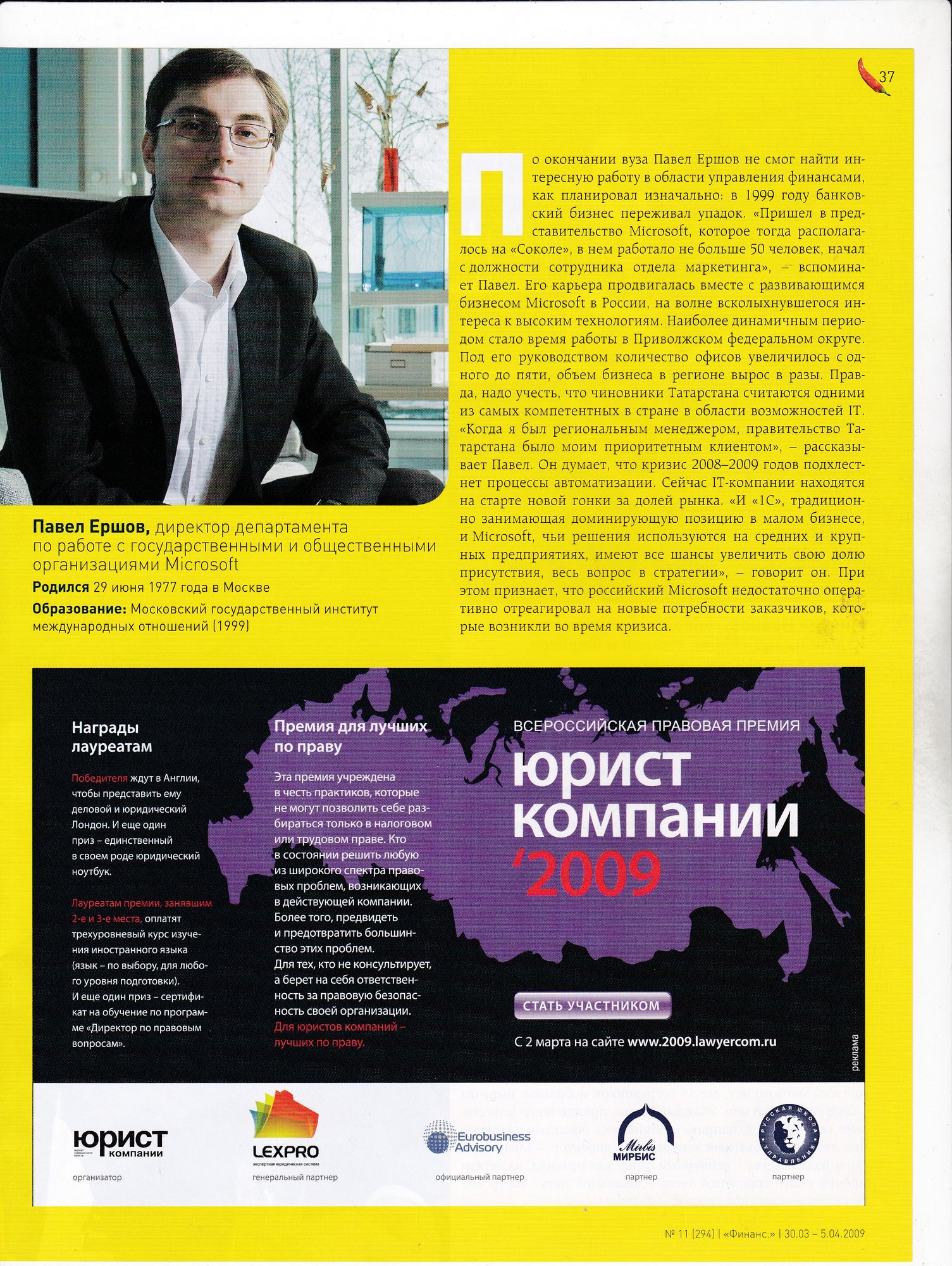 По окончании вуза Павел Ершов не смог найти интересную работу в области управления финансами, как планировал изначально: в 1999 году банковский бизнес переживал упадок. «Пришел в представительство Microsoft, которое тогда располагалось на «Соколе», в нем работало не больше 50 человек, начал с должности сотрудника отдела маркетинга», – вспоминает Павел. Его карьера продвигалась вместе с развивающимся бизнесом Microsoft в России, на волне всколыхнувшегося интереса к высоким технологиям. Наиболее динамичным периодом стало время работы в Приволжском федеральном округе. Под его руководством количество офисов увеличилось с одного до пяти, объем бизнеса в регионе вырос в разы. Правда, надо учесть, что чиновники Татарстана считаются одними из самых компетентных в стране в области возможностей IT. «Когда я был региональным менеджером, правительство Татарстана было моим приоритетным клиентом», – рассказывает Павел. Он думает, что кризис 2008–2009 годов подхлестнет процессы автоматизации. Сейчас IT-компании находятся на старте новой гонки за долей рынка. «И «1С», традиционно занимающая доминирующую позицию в малом бизнесе, и Microsoft, чьи решения используются на средних и крупных предприятиях, имеют все шансы увеличить свою долю присутствия, весь вопрос в стратегии», – говорит он. При этом признает, что российский Microsoft недостаточно оперативно отреагировал на новые потребности заказчиков, которые возникли во время кризиса.