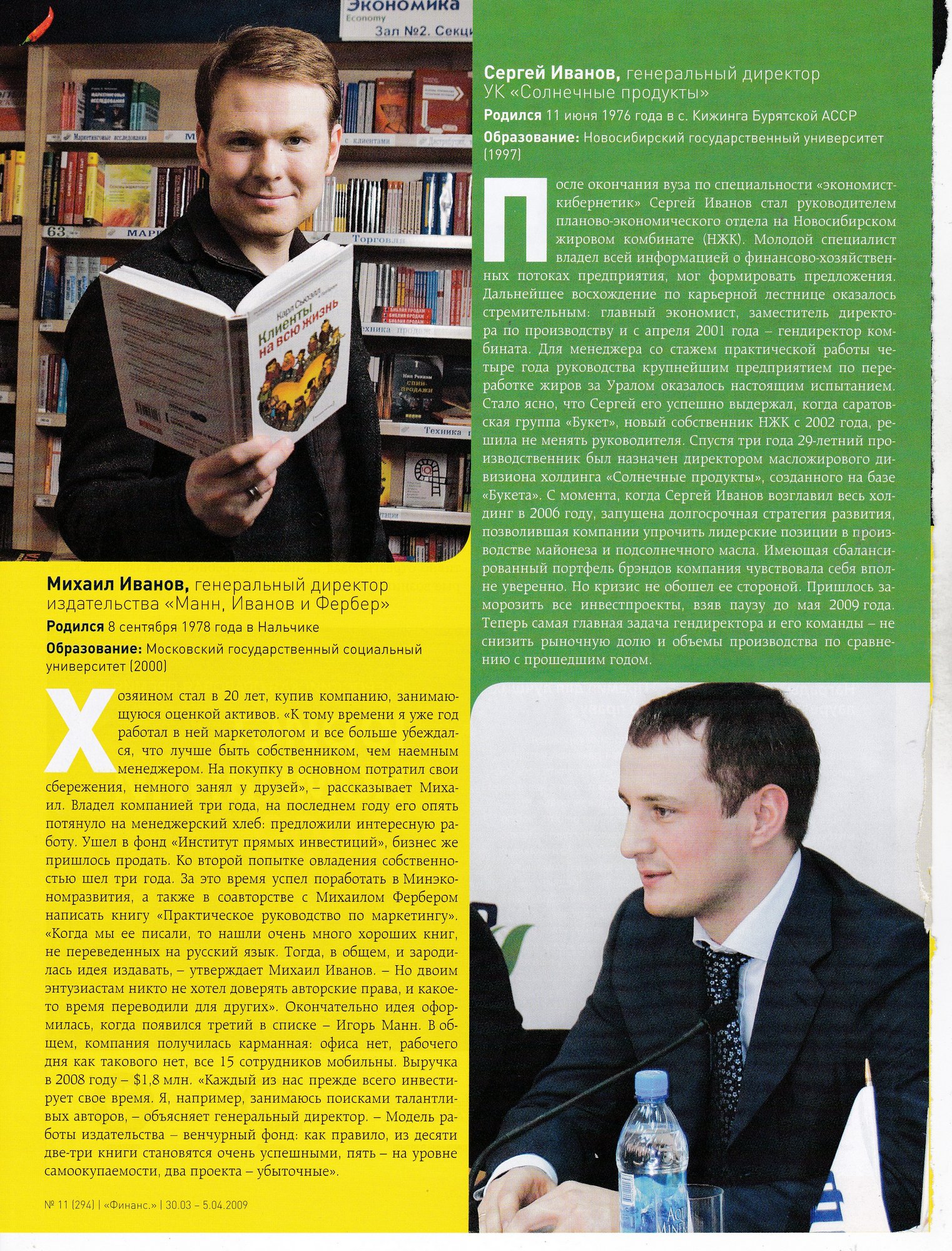 Хозяином стал в 20 лет, купив компанию, занимающуюся оценкой активов. «К тому времени я уже год работал в ней маркетологом и все больше убеждался, что лучше быть собственником, чем наемным менеджером. На покупку в основном потратил свои сбережения, немного занял у друзей», – рассказывает Михаил. Владел компанией три года, на последнем году его опять потянуло на менеджерский хлеб: предложили интересную работу. Ушел в фонд «Институт прямых инвестиций», бизнес же пришлось продать. Ко второй попытке овладения собственностью шел три года. За это время успел поработать в Минэкономразвития, а также в соавторстве с Михаилом Фербером написать книгу «Практическое руководство по маркетингу». «Когда мы ее писали, то нашли очень много хороших книг, не переведенных на русский язык. Тогда, в общем, и зародилась идея издавать, – утверждает Михаил Иванов. – Но двоим энтузиастам никто не хотел доверять авторские права, и какое-то время переводили для других». Окончательно идея оформилась, когда появился третий в списке – Игорь Манн. В общем, компания получилась карманная: офиса нет, рабочего дня как такового нет, все 15 сотрудников мобильны. Выручка в 2008 году – $1,8 млн. «Каждый из нас прежде всего инвестирует свое время. Я, например, занимаюсь поисками талантливых авторов, – объясняет генеральный директор. – Модель работы издательства – венчурный фонд: как правило, из десяти две-три книги становятся очень успешными, пять – на уровне самоокупаемости, два проекта – убыточные».
