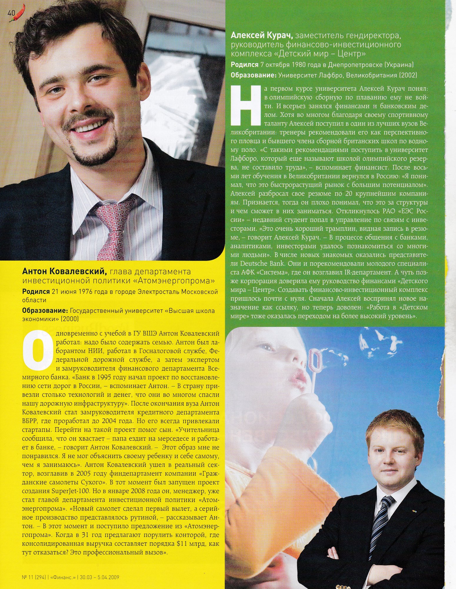 На первом курсе университета Алексей Курач понял: в олимпийскую сборную по плаванию ему не войти. И всерьез занялся финансами и банковским делом. Хотя во многом благодаря своему спортивному таланту Алексей поступил в один из лучших вузов Великобритании: тренеры рекомендовали его как перспективного пловца и бывшего члена сборной британских школ по водному поло. «С такими рекомендациями поступить в университет Лафборо, который еще называют школой олимпийского резерва, не составило труда», – вспоминает финансист. После восьми лет обучения в Великобритании вернулся в Россию: «Я понимал, что это быстрорастущий рынок с большим потенциалом». Алексей разбросал свое резюме по 20 крупнейшим компаниям. Признается, тогда он плохо понимал, что это за структуры и чем сможет в них заниматься. Откликнулось РАО «ЕЭС России» – недавний студент попал в управление по связям с инвесторами. «Это очень хороший трамплин, видная запись в резюме, – говорит Алексей Курач. – В процессе общения с банками, аналитиками, инвесторами удалось познакомиться со многими людьми». В числе новых знакомых оказались представители Deutsche Bank. Они и порекомендовали молодого специалиста АФК «Система», где он возглавил IR-департамент. А чуть позже корпорация доверила ему руководство финансами «Детского мира – Центр». Создавать финансово-инвестиционный комплекс пришлось почти с нуля. Сначала Алексей воспринял новое назначение как ссылку, но теперь доволен: «Работа в «Детском мире» тоже оказалась переходом на более высокий уровень».