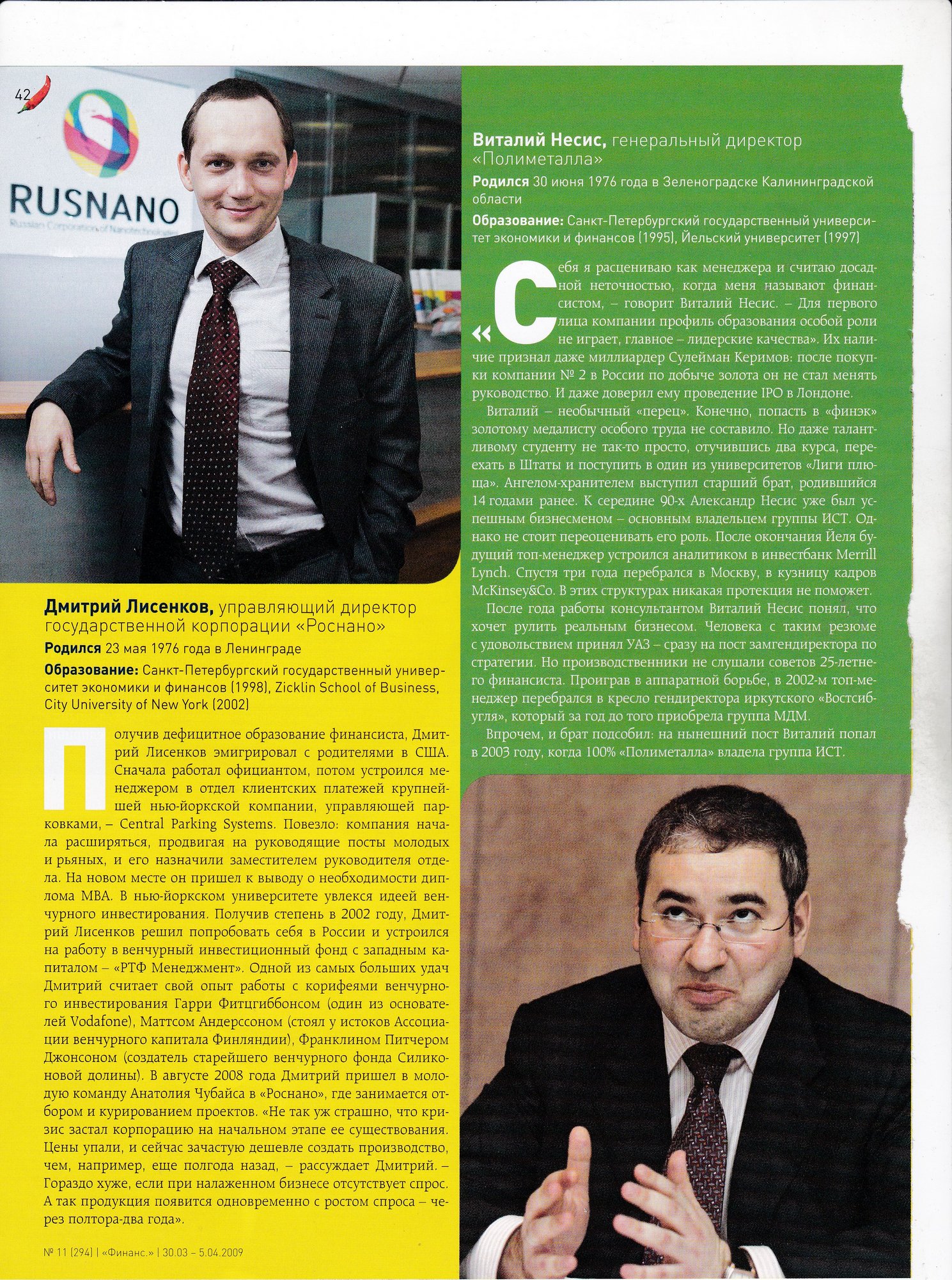 Получив дефицитное образование финансиста, Дмитрий Лисенков эмигрировал с родителями в США. Сначала работал официантом, потом устроился менеджером в отдел клиентских платежей крупнейшей нью-йоркской компании, управляющей парковками, – Central Parking Systems. Повезло: компания начала расширяться, продвигая на руководящие посты молодых и рьяных, и его назначили заместителем руководителя отдела. На новом месте он пришел к выводу о необходимости диплома MBA. В нью-йоркском университете увлекся идеей венчурного инвестирования. Получив степень в 2002 году, Дмитрий Лисенков решил попробовать себя в России и устроился на работу в венчурный инвестиционный фонд с западным капиталом – «РТФ Менеджмент». Одной из самых больших удач Дмитрий считает свой опыт работы с корифеями венчурного инвестирования Гарри Фитцгиббонсом (один из основателей Vodafone), Маттсом Андерссоном (стоял у истоков Ассоциации венчурного капитала Финляндии), Франклином Питчером Джонсоном (создатель старейшего венчурного фонда Силиконовой долины). В августе 2008 года Дмитрий пришел в молодую команду Анатолия Чубайса в «Роснано», где занимается отбором и курированием проектов. «Не так уж страшно, что кризис застал корпорацию на начальном этапе ее существования. Цены упали, и сейчас зачастую дешевле создать производство, чем, например, еще полгода назад, – рассуждает Дмитрий. – Гораздо хуже, если при налаженном бизнесе отсутствует спрос. А так продукция появится одновременно с ростом спроса – через полтора-два года».