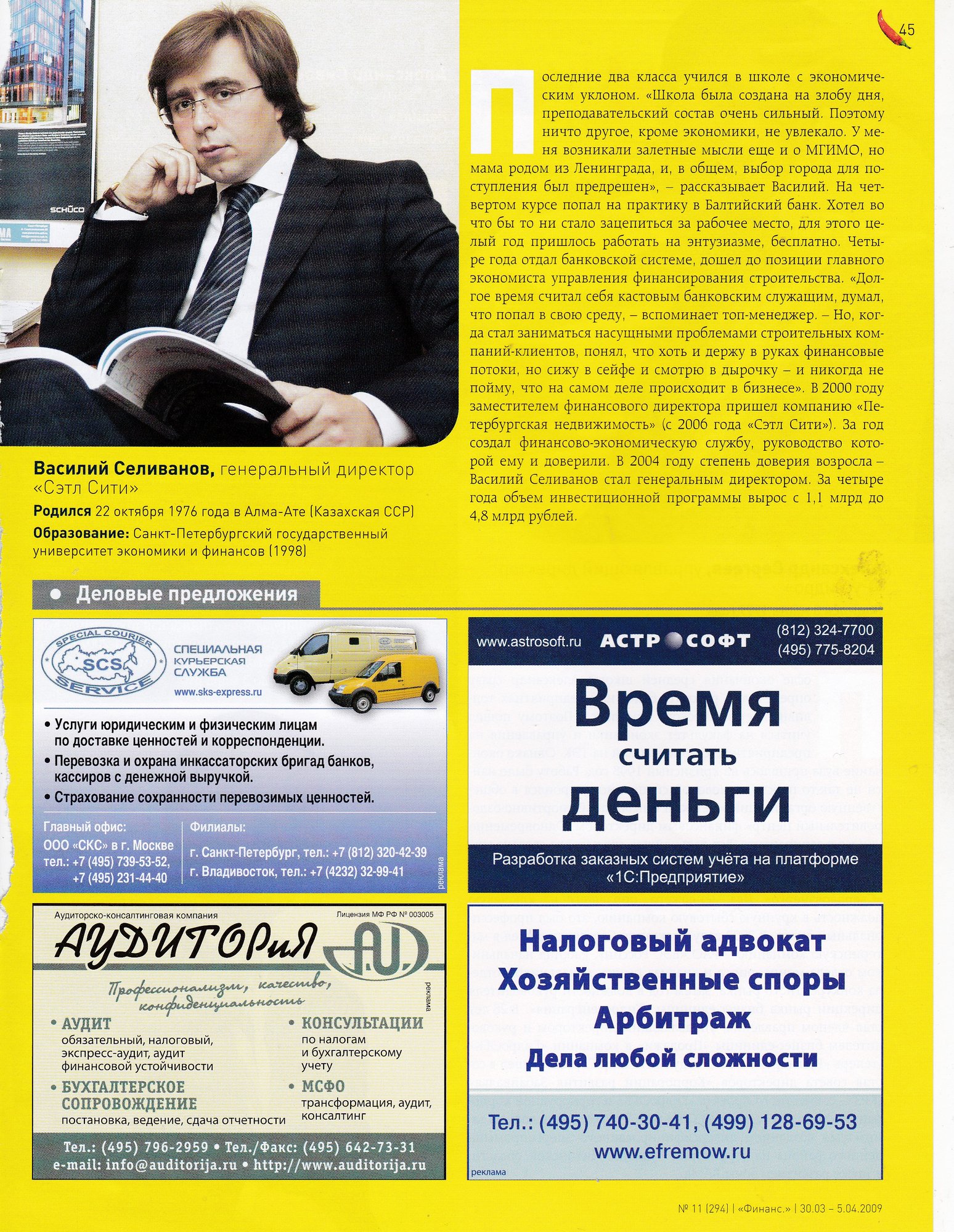 Последние два класса учился в школе с экономическим уклоном. «Школа была создана на злобу дня, преподавательский состав очень сильный. Поэтому ничто другое, кроме экономики, не увлекало. У меня возникали залетные мысли еще и о МГИМО, но мама родом из Ленинграда, и, в общем, выбор города для поступления был предрешен», – рассказывает Василий. На четвертом курсе попал на практику в Балтийский банк. Хотел во что бы то ни стало зацепиться за рабочее место, для этого целый год пришлось работать на энтузиазме, бесплатно. Четыре года отдал банковской системе, дошел до позиции главного экономиста управления финансирования строительства. «Долгое время считал себя кастовым банковским служащим, думал, что попал в свою среду, – вспоминает топ-менеджер. – Но, когда стал заниматься насущными проблемами строительных компаний-клиентов, понял, что хоть и держу в руках финансовые потоки, но сижу в сейфе и смотрю в дырочку – и никогда не пойму, что на самом деле происходит в бизнесе». В 2000 году заместителем финансового директора пришел компанию «Петербургская недвижимость» (с 2006 года «Сэтл Сити»). За год создал финансово-экономическую службу, руководство которой ему и доверили. В 2004 году степень доверия возросла – Василий Селиванов стал генеральным директором. За четыре года объем инвестиционной программы вырос с 1,1 млрд до 4,8 млрд рублей.