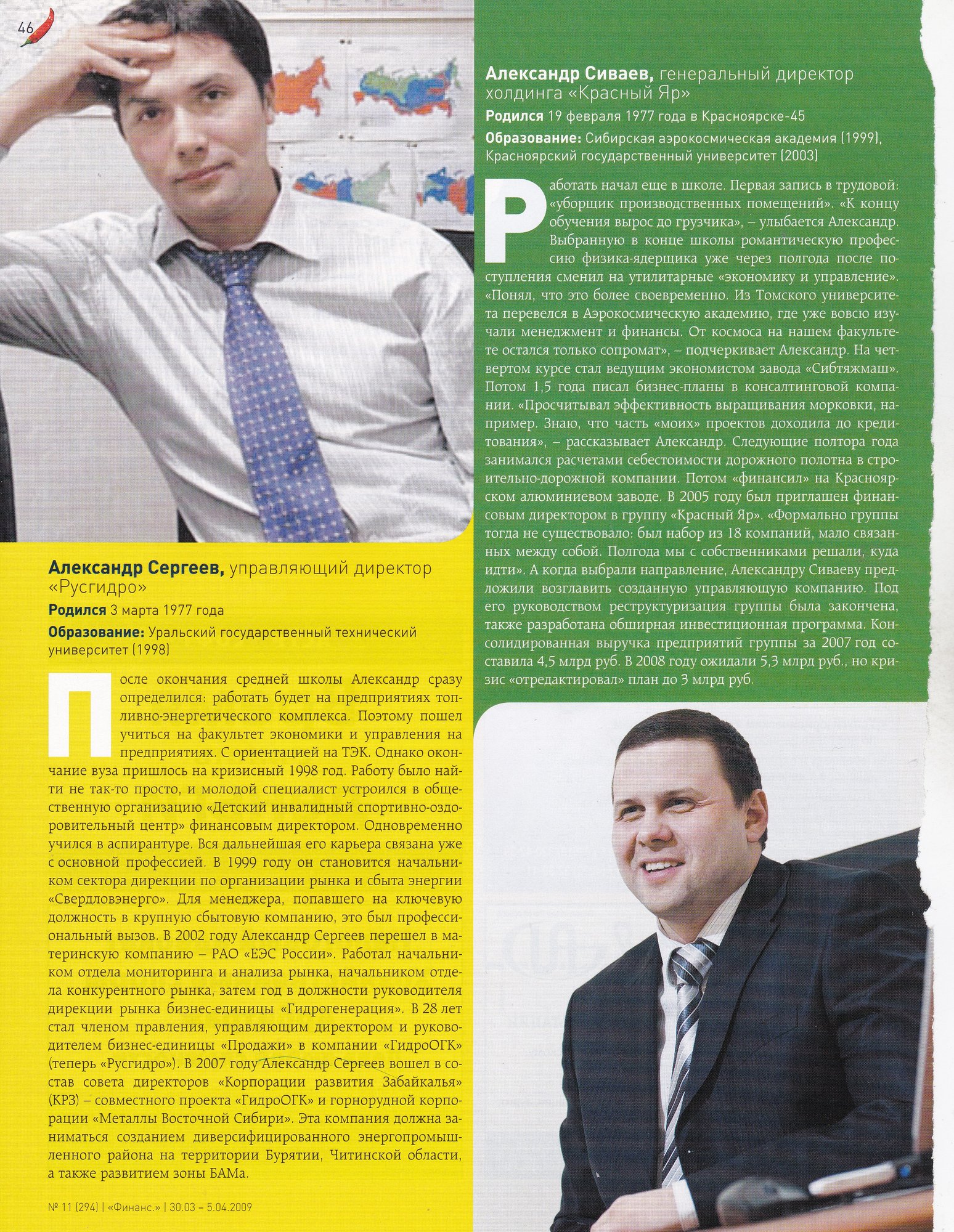 Работать начал еще в школе. Первая запись в трудовой: «уборщик производственных помещений». «К концу обучения вырос до грузчика», – улыбается Александр. Выбранную в конце школы романтическую профессию физика-ядерщика уже через полгода после поступления сменил на утилитарные «экономику и управление». «Понял, что это более своевременно. Из Томского университета перевелся в Аэрокосмическую академию, где уже вовсю изучали менеджмент и финансы. От космоса на нашем факультете остался только сопромат», – подчеркивает Александр. На четвертом курсе стал ведущим экономистом завода «Сибтяжмаш». Потом 1,5 года писал бизнес-планы в консалтинговой компании. «Просчитывал эффективность выращивания морковки, например. Знаю, что часть «моих» проектов доходила до кредитования», – рассказывает Александр. Следующие полтора года занимался расчетами себестоимости дорожного полотна в строительно-дорожной компании. Потом «финансил» на Красноярском алюминиевом заводе. В 2005 году был приглашен финансовым директором в группу «Красный Яр». «Формально группы тогда не существовало: был набор из 18 компаний, мало связанных между собой. Полгода мы с собственниками решали, куда идти». А когда выбрали направление, Александру Сиваеву предложили возглавить созданную управляющую компанию. Под его руководством реструктуризация группы была закончена, также разработана обширная инвестиционная программа. Консолидированная выручка предприятий группы за 2007 год составила 4,5 млрд руб. В 2008 году ожидали 5,3 млрд руб., но кризис «отредактировал» план до 3 млрд руб.