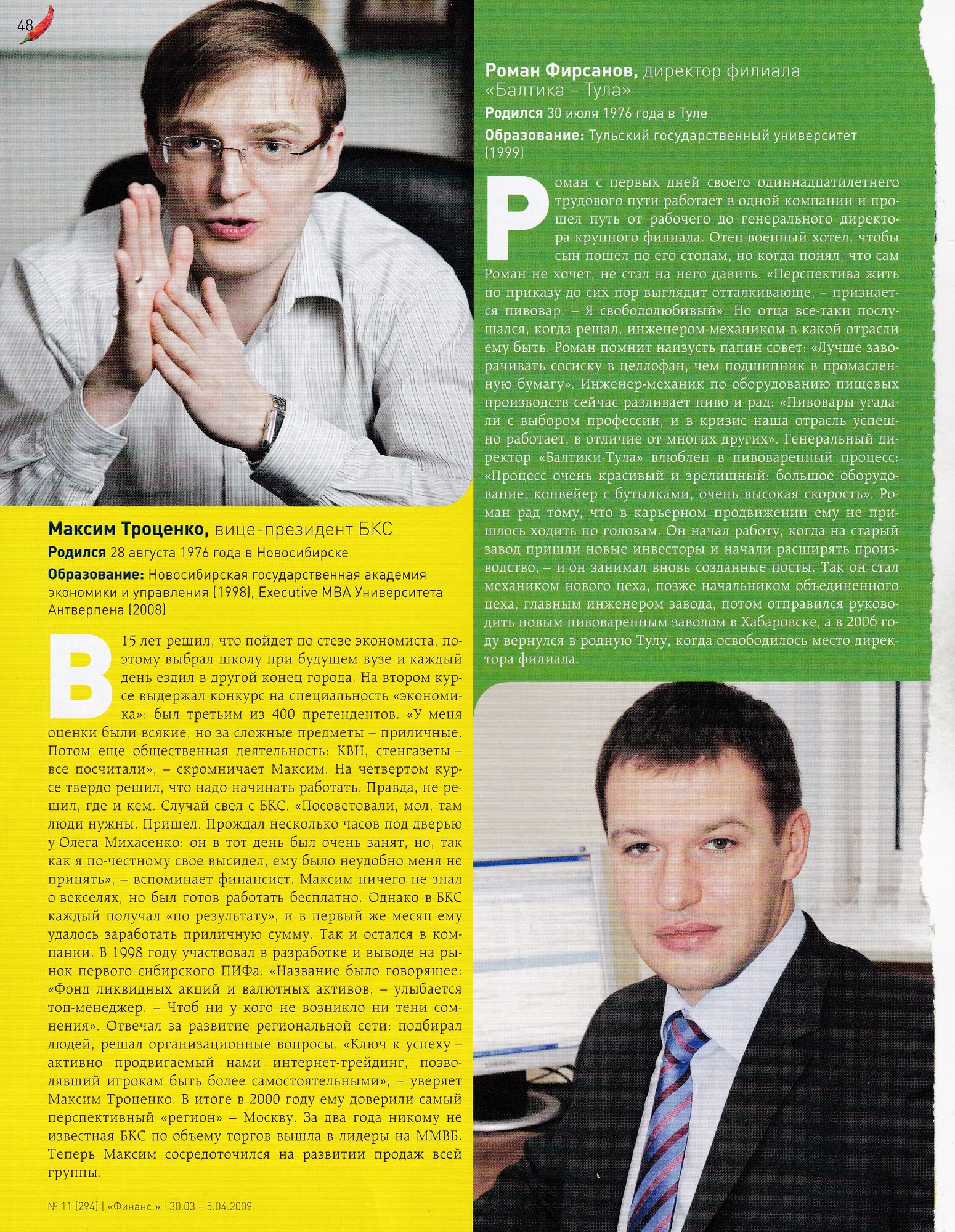 В 15 лет решил, что пойдет по стезе экономиста, поэтому выбрал школу при будущем вузе и каждый день ездил в другой конец города. На втором курсе выдержал конкурс на специальность «экономика»: был третьим из 400 претендентов. «У меня оценки были всякие, но за сложные предметы – приличные. Потом еще общественная деятельность: КВН, стенгазеты – все посчитали», – скромничает Максим. На четвертом курсе твердо решил, что надо начинать работать. Правда, не решил, где и кем. Случай свел с БКС. «Посоветовали, мол, там люди нужны. Пришел. Прождал несколько часов под дверью у Олега Михасенко: он в тот день был очень занят, но, так как я по-честному свое высидел, ему было неудобно меня не принять», – вспоминает финансист. Максим ничего не знал о векселях, но был готов работать бесплатно. Однако в БКС каждый получал «по результату», и в первый же месяц ему удалось заработать приличную сумму. Так и остался в компании. В 1998 году участвовал в разработке и выводе на рынок первого сибирского ПИФа. «Название было говорящее: «Фонд ликвидных акций и валютных активов, – улыбается топ-менеджер. – Чтоб ни у кого не возникло ни тени сомнения». Отвечал за развитие региональной сети: подбирал людей, решал организационные вопросы. «Ключ к успеху – активно продвигаемый нами интернет-трейдинг, позволявший игрокам быть более самостоятельными», – уверяет Максим Троценко. В итоге в 2000 году ему доверили самый перспективный «регион» – Москву. За два года никому не известная БКС по объему торгов вышла в лидеры на ММВБ. Теперь Максим сосредоточился на развитии продаж всей группы.