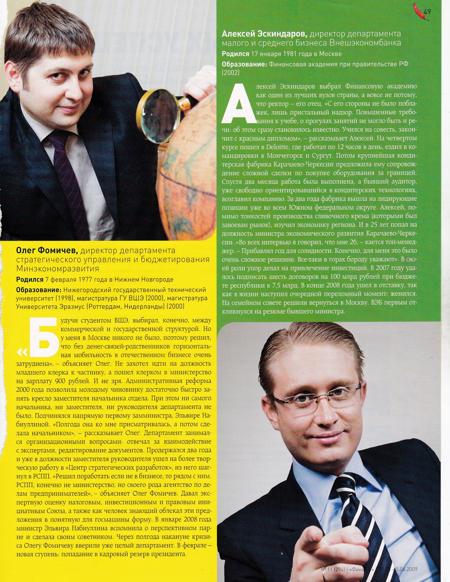 «Будучи студентом ВШЭ, выбирал, конечно, между коммерческой и государственной структурой. Но у меня в Москве никого не было, поэтому решил, что без денег-связей-родственников горизонтальная мобильность в отечественном бизнесе очень затруднена», – объясняет Олег. Не захотел идти на должность младшего клерка к частнику, а пошел клерком в министерство на зарплату 900 рублей. И не зря. Административная реформа 2000 года позволила молодому чиновнику достаточно быстро занять кресло заместителя начальника отдела. При этом ни самого начальника, ни заместителя, ни руководителя департамента не было. Подчинялся напрямую первому замминистра, Эльвире Набиуллиной. «Полгода она ко мне присматривалась, а потом сделала начальником», – рассказывает Олег. Департамент занимался организационными вопросами: отвечал за взаимодействие с экспертами, редактирование документов. Продержался два года и уже в должности заместителя руководителя ушел на более творческую работу в «Центр стратегических разработок», из него шагнул в РСПП. «Решил поработать если не в бизнесе, то рядом с ним. РСПП, конечно не министерство, но своего рода агентство по делам предпринимателей», – объясняет Олег Фомичев. Давал экспертную оценку налоговым, инвестиционным и правовым инициативам Союза, а также как человек знающий облекал эти предложения в понятную для госмашины форму. В январе 2008 года министр Эльвира Набиуллина вспомнила о перспективном парне и сделала своим советником. Через полгода накануне кризиса Олегу Фомичеву вверили уже целый департамент. В феврале – новая ступень: попадание в кадровый резерв президента.