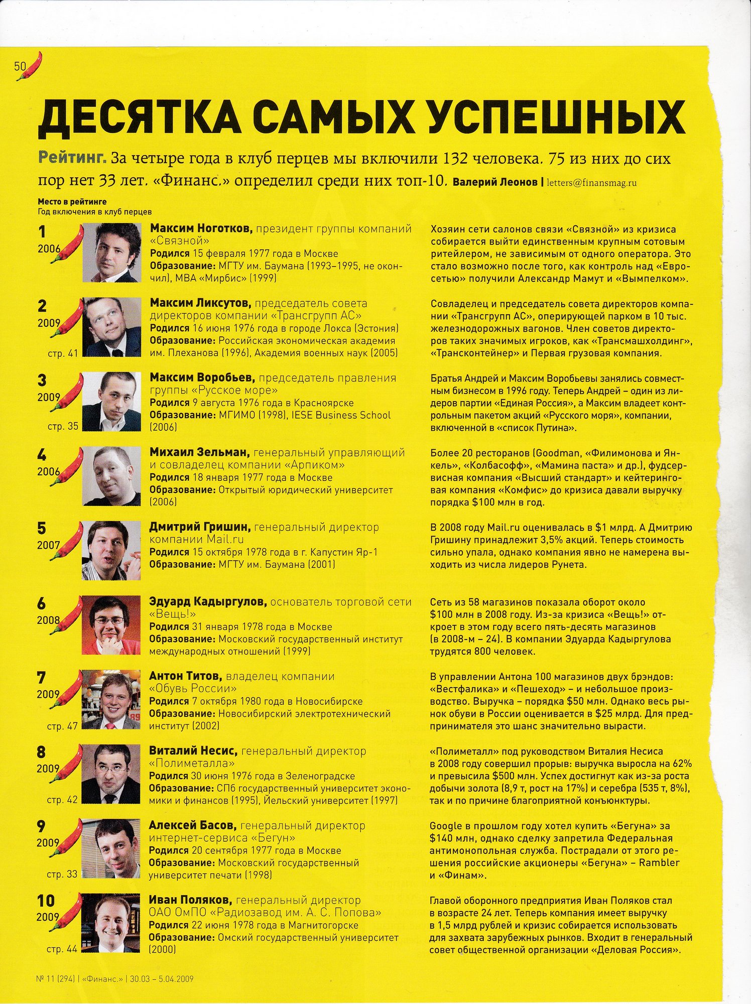 Новацией проекта стал список десяти самых успешных перцев. В него мы включили только людей из мира бизнеса, потому как сравнивать их с чиновниками не вполне корректно. В список вошли люди из всех четырех серий проекта с одним непременным условием: им всем до сих пор не исполнилось 33 лет. Самым успешным признали перца-2006, президента «Связного» Максима Ноготкова (стр. 50).