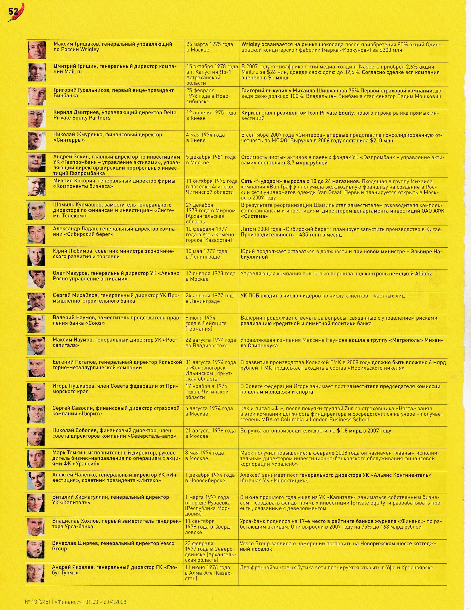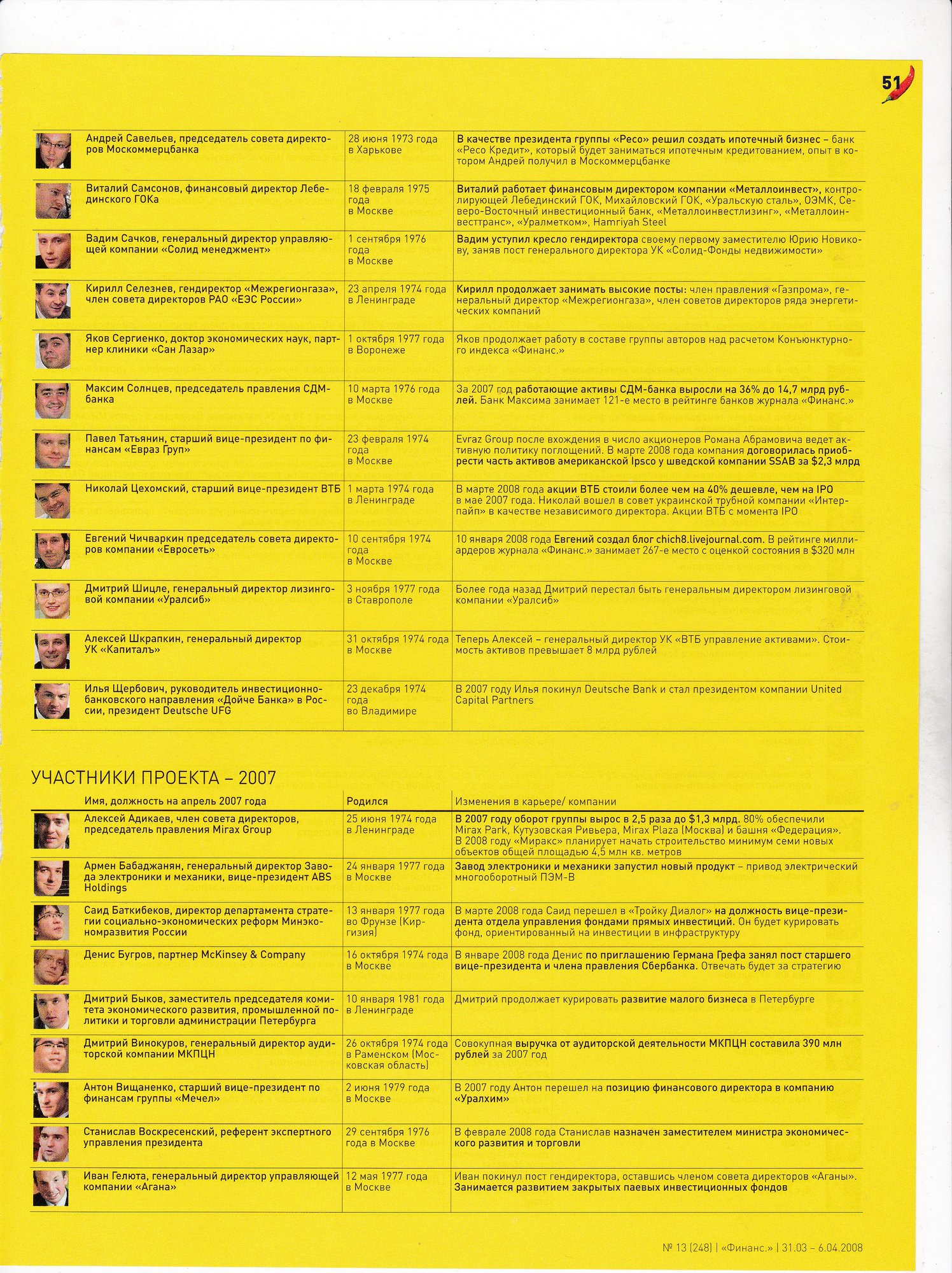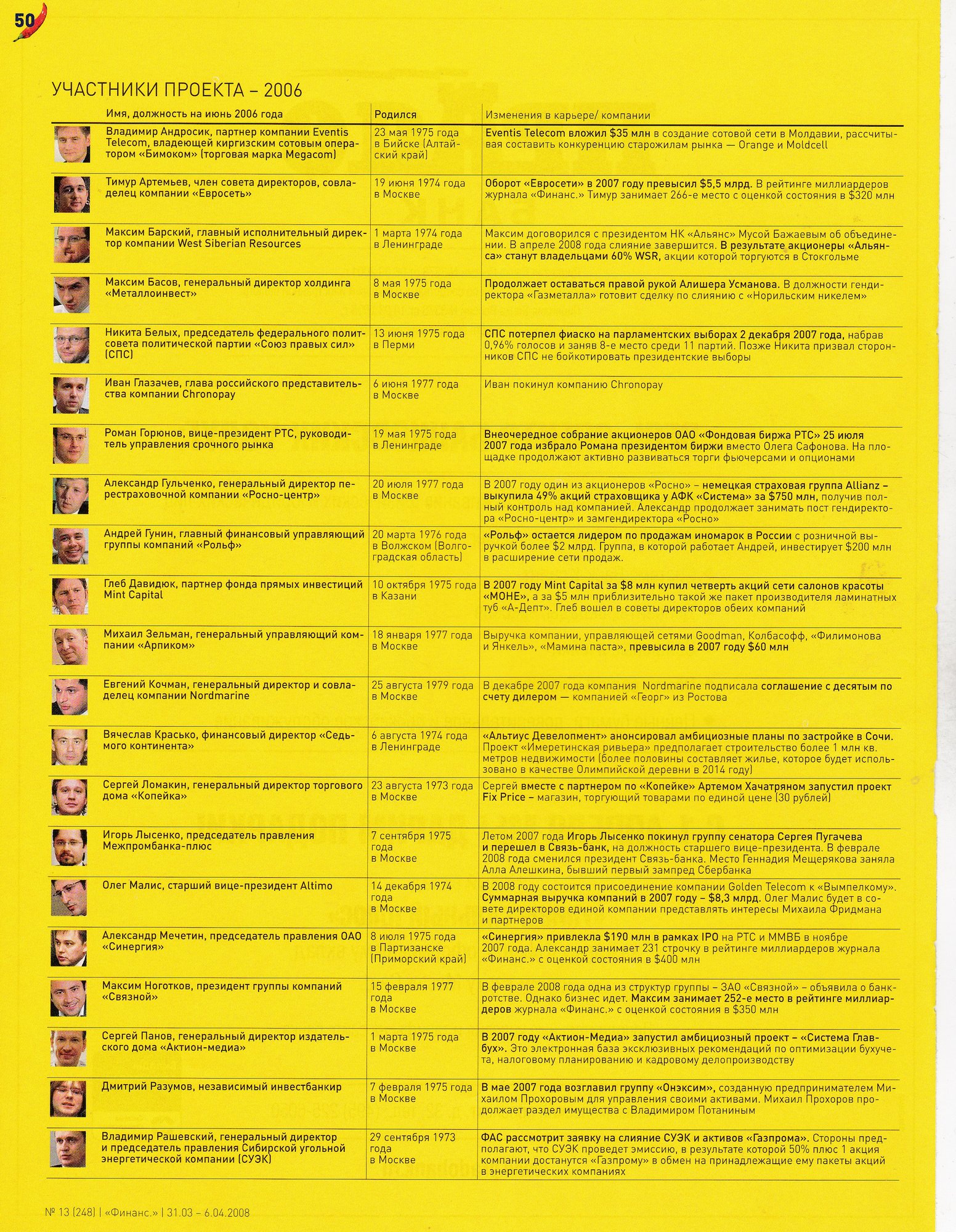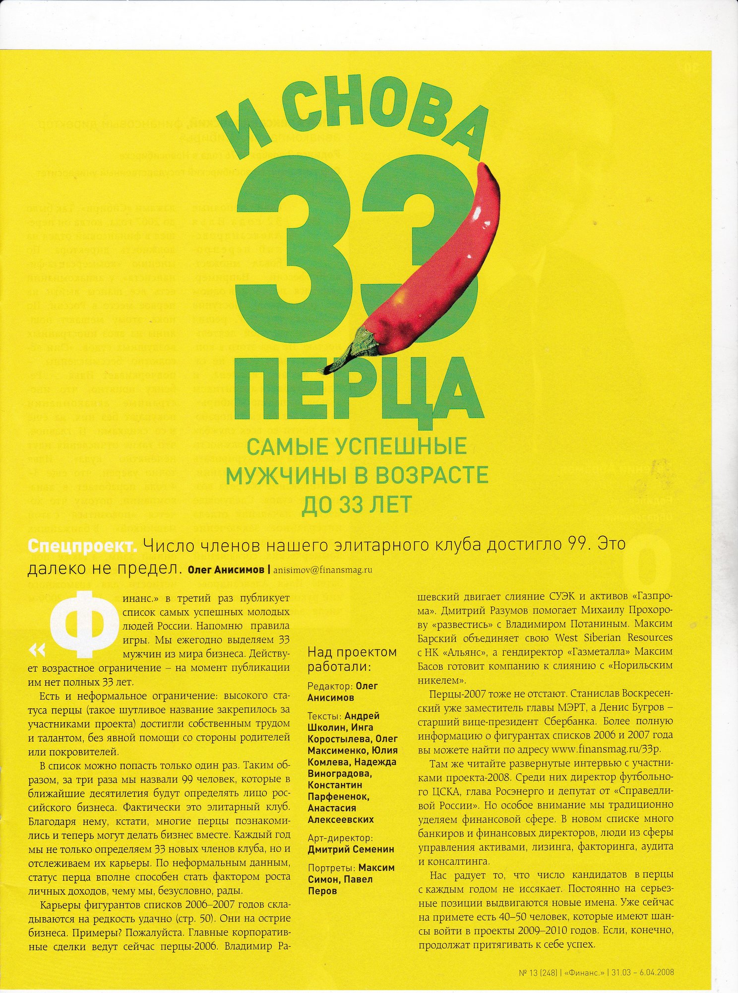 С 2003 по 2010 год мне посчастливилось работать главным редактором журнала «Финанс.». Среди массы интересных проектов был список «33 перца», в который мы ежегодно включали (и не чаще одного раза) мужчин из области бизнеса/управления, которым на дату выхода журнала из печати не исполнилось ещё 33 лет. Здесь я собрал 165 интересных людей, попадавших в список в 2006-2010 годах.