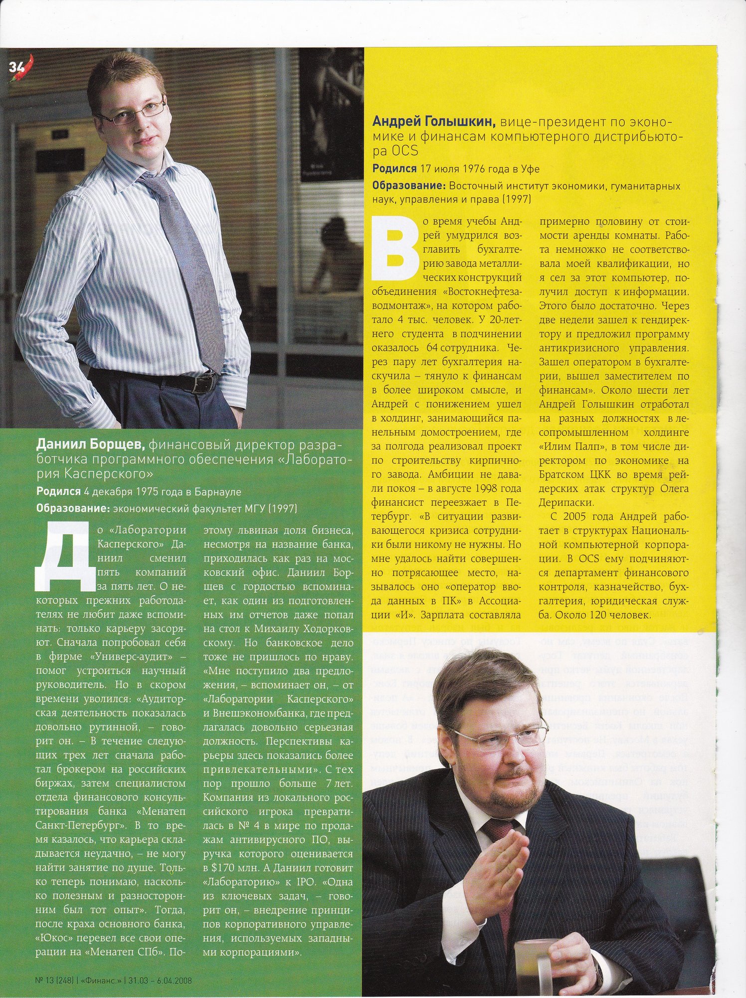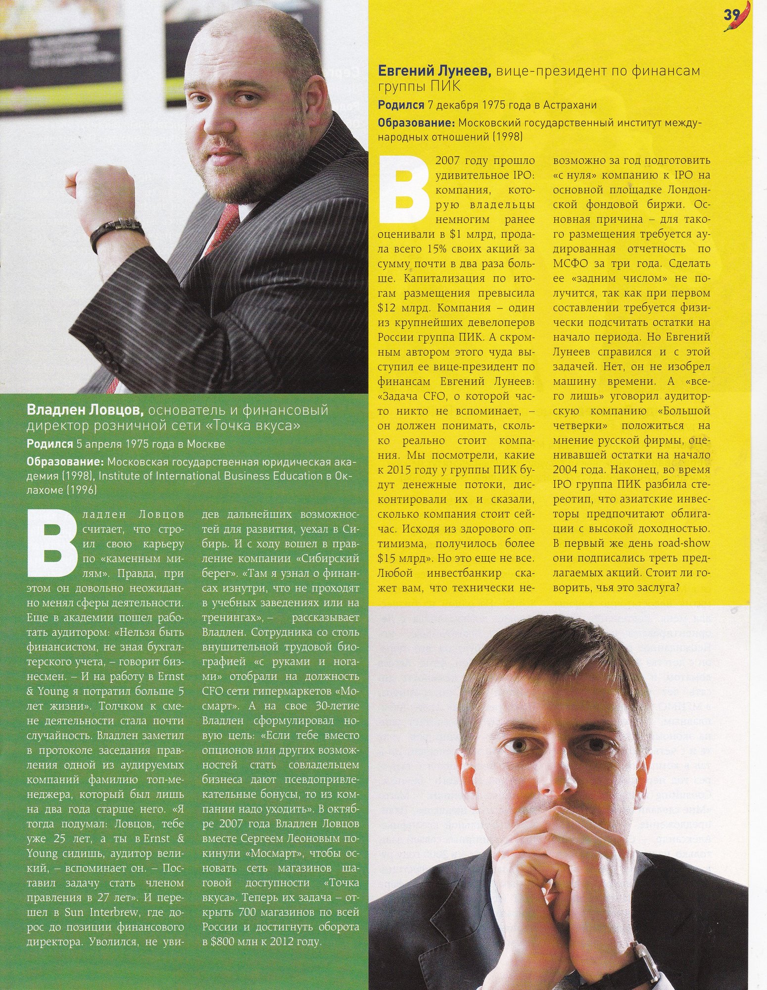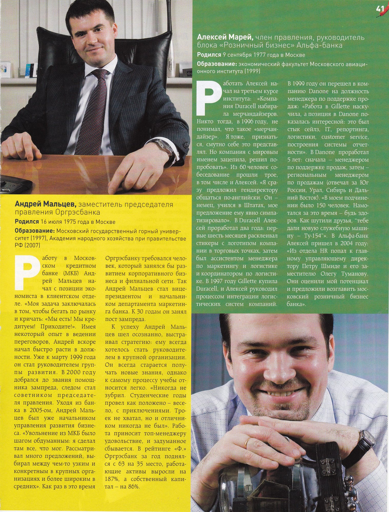 «Доволен ли я своим положением? Да, мне нравится моя работа. Хотя 10 лет назад я рассчитывал достигнуть к 30 годам большего. Не все получилось, но я уверен, что это временно — я всегда ставлю перед собой очень сложные задачи». Между тем под руководством Андрея Гунина «Рольф» взял один из самых крупных синдицированных кредитов, выданных западными банками частной российской компании, — $350 млн вызывают у Андрея понятную гордость. Кроме того, проведена реструктуризация компании, набрана команда новых талантливых специалистов, начат выпуск отчетности по стандартам MCФO.