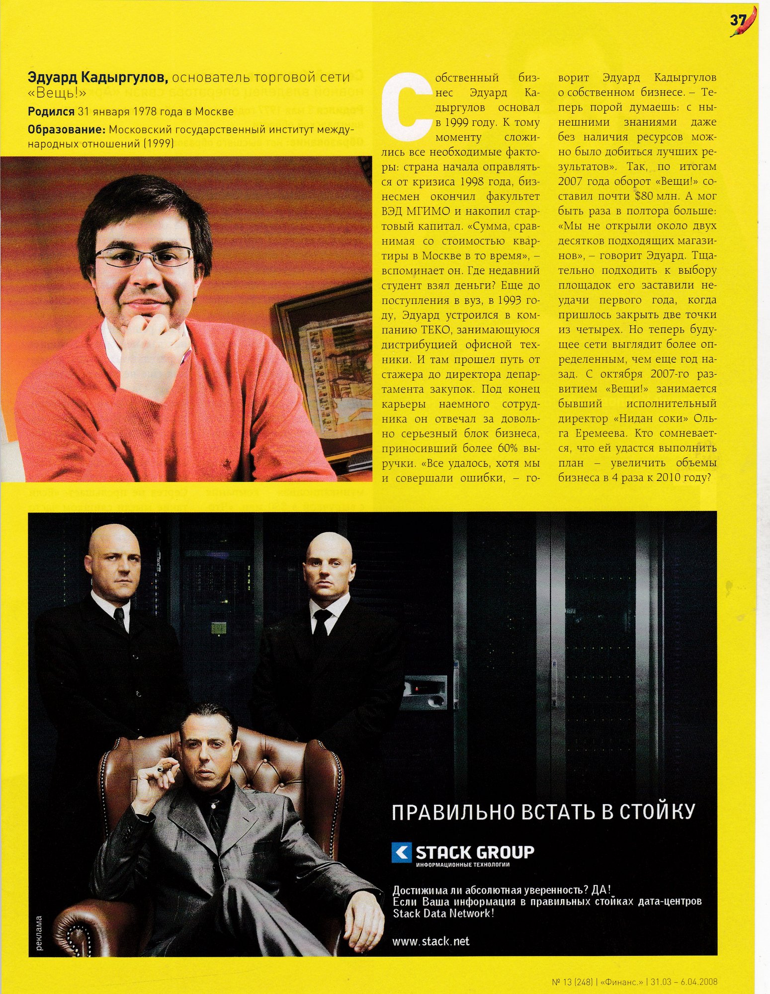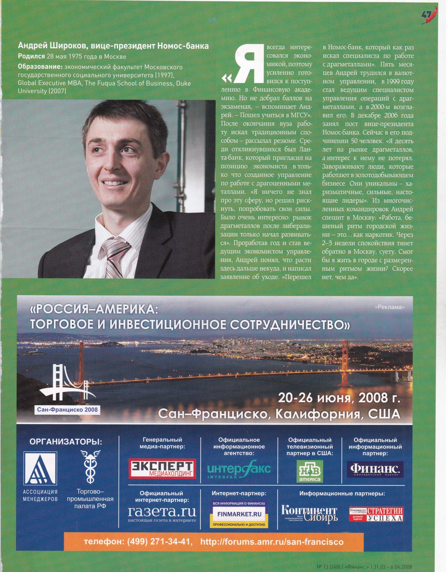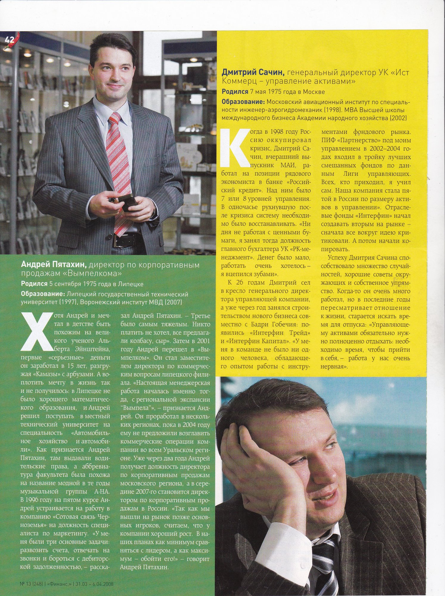 «Доволен ли я своим положением? Да, мне нравится моя работа. Хотя 10 лет назад я рассчитывал достигнуть к 30 годам большего. Не все получилось, но я уверен, что это временно — я всегда ставлю перед собой очень сложные задачи». Между тем под руководством Андрея Гунина «Рольф» взял один из самых крупных синдицированных кредитов, выданных западными банками частной российской компании, — $350 млн вызывают у Андрея понятную гордость. Кроме того, проведена реструктуризация компании, набрана команда новых талантливых специалистов, начат выпуск отчетности по стандартам MCФO.