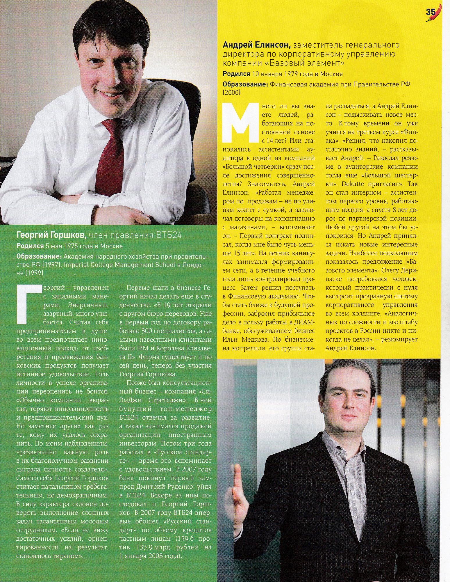 1. Мы не включали в список молодых людей, имеющих богатых родственников, например 24-летнего Николая Смоленского, которому папа-банкир купил автомобильный завод в Британии. По этой же причине в список не вошли и другие рублевые миллиардеры — чьи-либо родственники. 2. Мы не включали высокопоставленных родственников влиятельных людей, таких как 25-летний вице-президент Газпромбанка Сергей Иванов — сын одноименного министра обороны. Или 23-летний Владимир Кириенко, ставший в июне 2006 года председателем совета директоров Саровбизнесбанка. Банку атомного города — сына главы Росатома! Но не нам в список. 3. Мы не брали в расчет спортсменов, музыкантов, актеров и т. п. 4. Мы отдавали предпочтение мужчинам, работающим в крупном бизнесе и финансовой сфере. Финансовый директор крупной компании без доли в ней для нас более успешен, чем собственник малого бизнеса или гендиректор сервисной компании. 5.Мы не могли включить в список людей, имеющих нулевую известность. Публичность — одна из характеристик успеха. Если вы знаете других успешных людей, сообщите об их достижениях, и мы про них напишем.