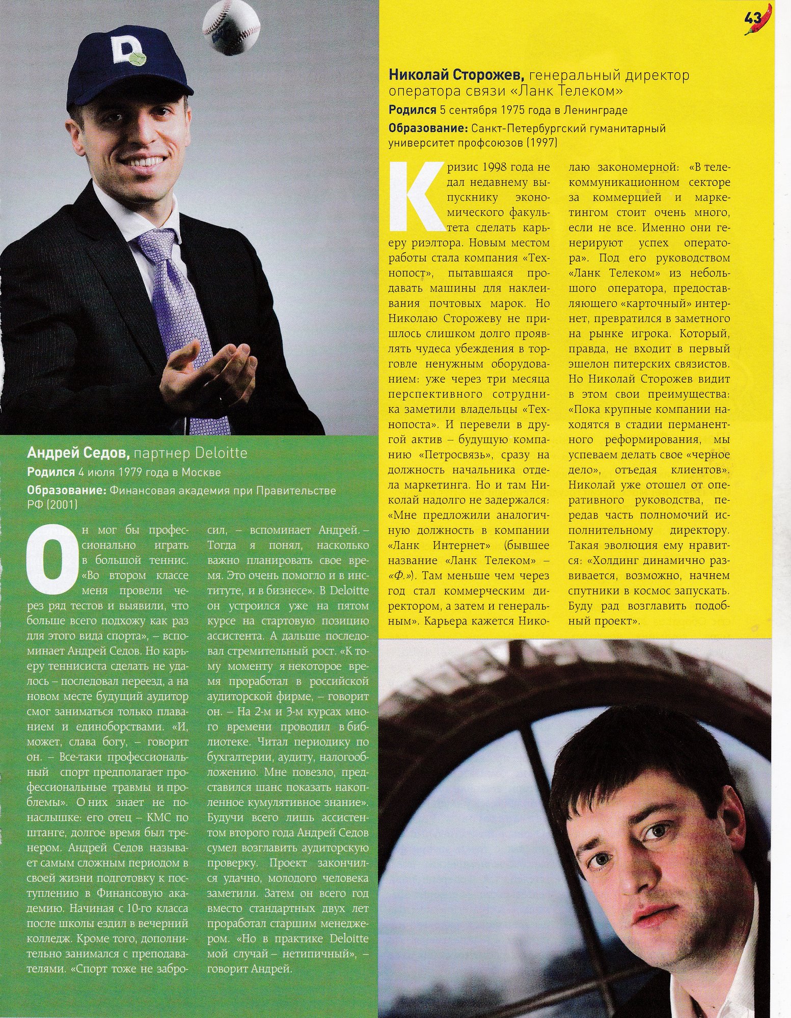 Спорт точно тянет на национальную идею. По крайней мере юные и успешные понимают всю его пользу. Генерального директора «Нэттрэйдера» Дениса Матафонова (стр. 21) не оторвать от сноуборда и доски для серфинга. Финансовый директор «Росинтер Ресторантс» Виктор Шлепов (стр. 29) выпускает адреналин, участвуя в мотокроссах. Да что там, в списке оказалось несколько бывших профессиональных спортсменов. Двухметровый Владимир Чубарь из Московского кредитного банка был чемпионом Московской области по баскетболу (стр. 27). Заместитель гендиректора «Росно» Арташес Сивков мог стать олимпийским чемпионом по плаванию, если бы не травмы (стр. 24). А генеральный директор Rover Computers Сергей Смирнов ради торговли компьютерами забросил футбол (стр. 26).