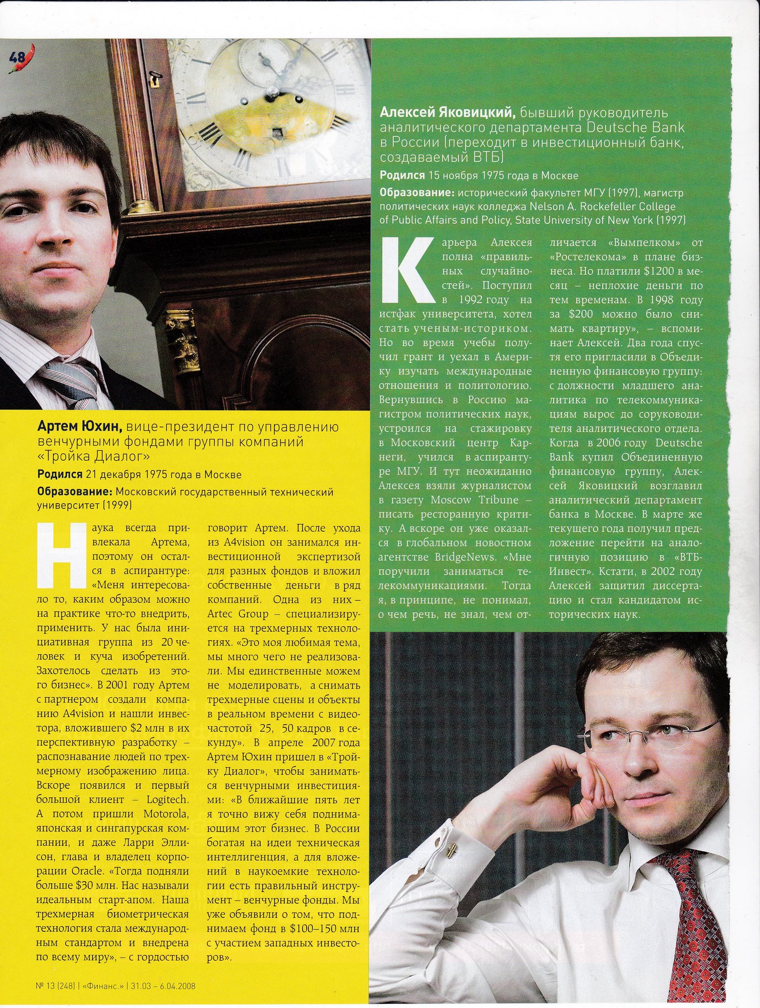 Айдар Калиев пришел в венчурный бизнес всего месяц назад и уже считает, что в России много гениальных инженеров. «Однако они не всегда могут конкурировать с остальным миром в части коммерциализации», – сетует он. Работа в ВТБ не первый его технологичный стартап. С 2008 года он занимал пост председателя совета директоров оператора «Сумма Телеком», который с 2005 года пытался стать федеральным WiMAX-оператором. «С сентября 2008 года мы взяли курс на развитие фиксированного широкополосного доступа (ШПД) в интернет по технологии FTTx. И уже меньше чем через год мы начали эксплуатацию сетей в семи городах России, а также в Киеве», – рассказывает он. Сейчас абонентская база компании насчитывает свыше 60 тыс. человек. Айдар стартовал феерично. В 24 года он стал первым заместителем генерального директора компании «Кыргызгаз». «Начиная с зимы 2001–2002 года Киргизия ни разу не испытала проблем с перебоями в газоснабжении», – гордится он. Спустя год он был уже заместителем генерального директора по финансам, экономике и международным отношениям компании «Электрические станции» (Киргизия). «Однажды контракт на поставку газа был подписан мной в Ташкенте 31 декабря в 10 часов вечера, – вспоминает Айдар. – А ведь еще надо было успеть к семье к праздничному новогоднему столу за 1000 км». Но самым амбициозным проектом считает создание с нуля телекоммуникационного холдинга Eventis Telecom. Всего за два года была создана компания с оборотом более $100 млн, работающая с положительной EBITDA. «А за молдавскую лицензию мы боролись на конкурсе наравне с российскими операторами «большой тройки». Наша победа стала настоящей сенсацией на рынке», – с радостью вспоминает он.