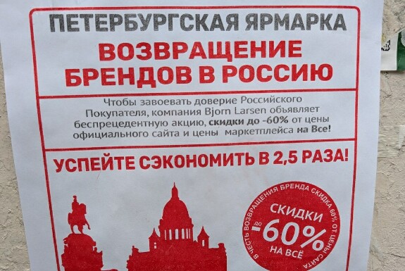 Глубинному народу по телевизору рассказали, что западные марки мечтают о возвращении в Россию. Этим пользуются мошенники. У них тур по спальным районам Петербурга. Якобы норвежская марка Bjorn Larsen, «чтобы завоевать доверие Российского Покупателя» объявляет беспрецедентную акцию, скидки до 60% от цены официального сайта». Но никакой норвежской марки Bjorn Larsen не существует, есть некая поделка под скандинавский стиль сомнительного качества. Вблизи лучше не рассматривать.