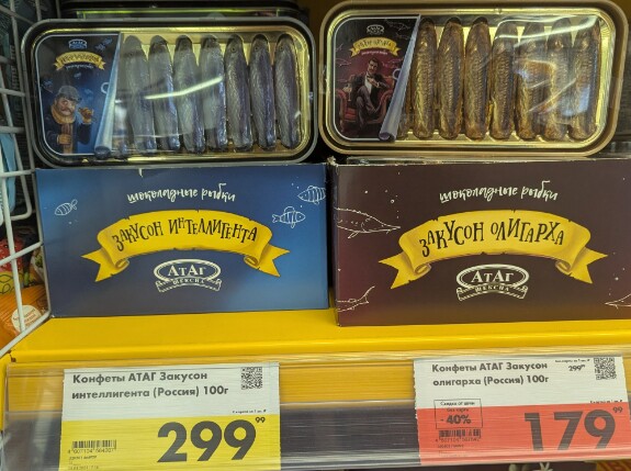 Лет 8 назад мне подарили такой странный набор конфет в виде рыб. Судя по тому, что «Закусон интеллигента» и «Закусон олигарха» теперь продаются в «Ленте», значит, продажи есть. Что скажешь, молодцы.