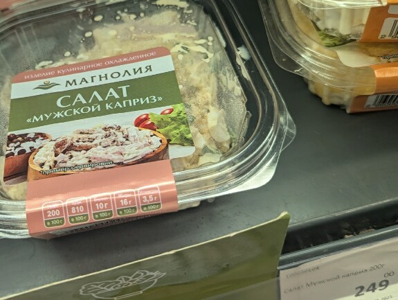 Оказывается, мужской каприз за 249 рублей состоит из филе куриного, опят консервированных, ветчины из свинины, стабилизаторов Е451, Е452, загустителя Е407, глюкозы, усилителя вкуса Е621, соли, майонез 67%, яйца, лука репчатого и зелёного.