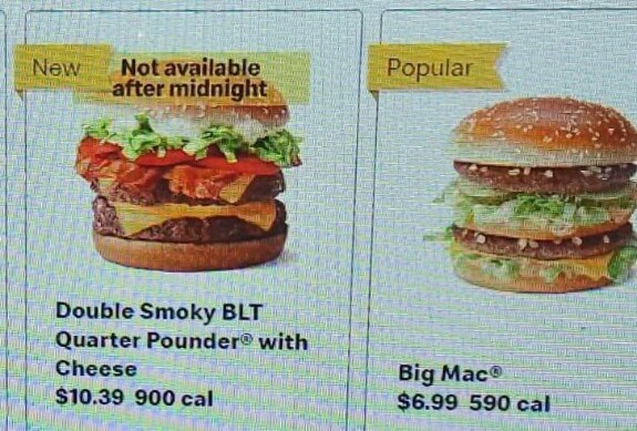 Довольно логичный закон действует в США. Фастфуды, если у них не менее 20 точек, обязаны указывать калорийность каждого блюда прямо в меню. Выглядит это так.