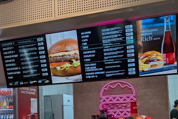 Я тут сильно ругал BB&Burgers за две глупости, но теперь придётся похвалить за творческое решение с меню. Картинки меняются, слева выделен рамочкой показываемый продукт. Лаконично и крупно.
