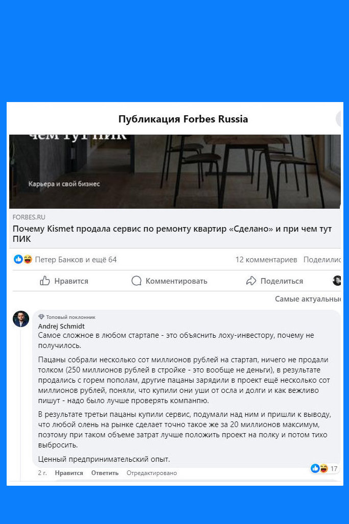 «Пацаны собрали несколько сот миллионов рублей на стартап, ничего не продали толком (250 миллионов рублей в стройке — это вообще не деньги), в результате продались с горем пополам, другие пацаны зарядили в проект ещё несколько сот миллионов, поняли, что купили уши от осла и долги. И, как вежливо пишут, стоило лучше проверять компанию. В результате третьи пацаны купили сервис, подумали над ним и пришли к выводу, что любой олень на рынке сделает точно такое же за 20 миллионов максимум, поэтому лучше положить проект на полку и потом тихо выбросить. Ценный предпринимательский опыт», — едко комментировал сделку Андрей Шмидт, управляющий партнёр юридической фирмы Schmidt & Schmidt.