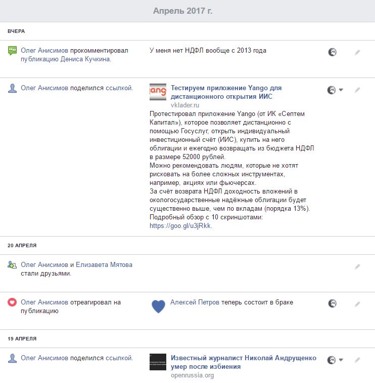 Если хотите узнать, что вы делали на Facebook (посты, отметки и пр.) войдите в систему и идите по адресу https://www.facebook.com/oanisimov/allactivity, предварительно поменяв oanisimov на ваше идентификатор в социальной сети.