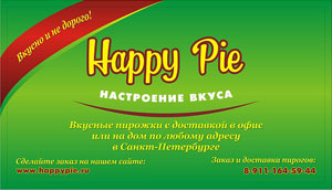 Вот с этой точки отсчета и начался мой бизнес. Сразу оговорюсь, что бабушек, конечно, мы на трассе так и не поставили, но пирожковый бизнес пошел в гору. Началось все с интернет магазина. Мой муж дал идею сделать сайт (happypie.ru) Он сам по образованию программист, у него своя фирма и окружение – люди, понимающие в программировании сайта и других технических моментах. За копейки (если нужны цифры это порядка 6000 рублей) по финскому шаблону мы разработали сайт, долго с дизайнером работали над логотипом (логотип обошелся нам в 6500 рублей) – цены очень маленькие, потому что работали знакомые, печать визиток мне обошлась в районе 500 рублей и начали работать. Пока сайт не был в топе в Яндексе (со временем мы наняли агентство по продвижению сайта) своими силами развешивали на бесплатных сайтах объявления о нас, постились на форумах. Это дало свои пусть и не большие, но результаты — появились первые клиенты.