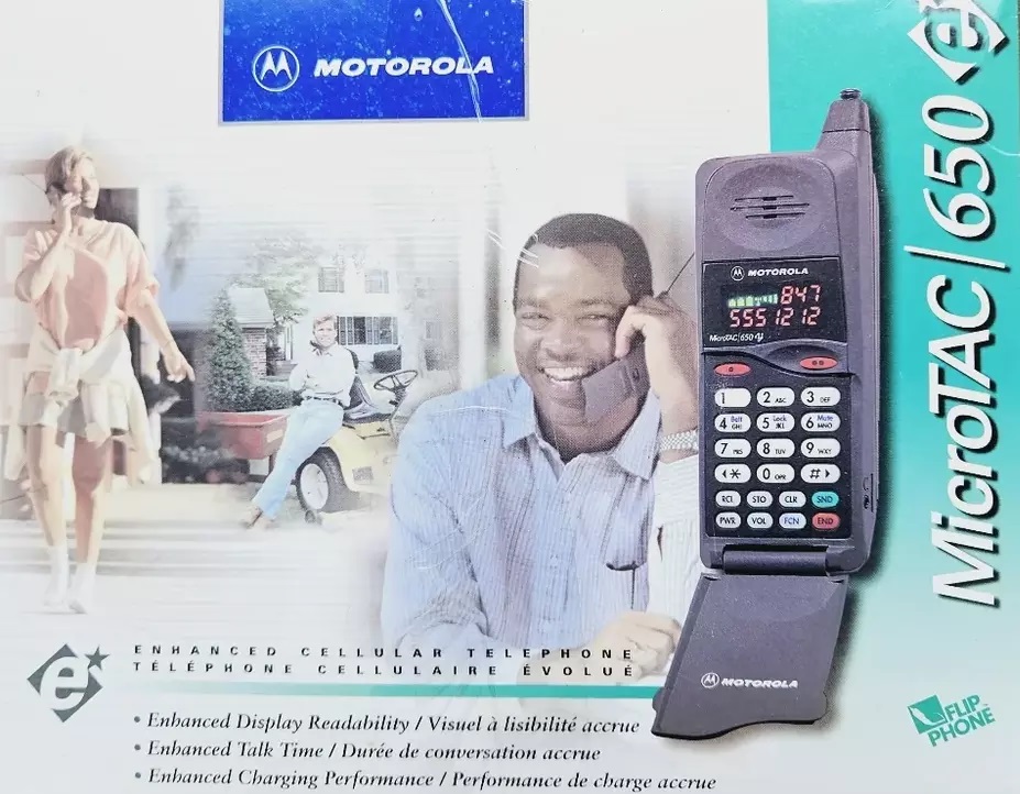 Но потом пошло довольно быстрое снижение тарифов, и уже в 1998 году у меня появился первый сотовый телефон. Это была раскладная моторола от фирмы Fora Communications, которая работала в американском стандарте AMPS в Санкт-Петербурге. Вот такой: