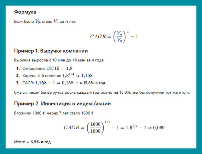 CAGR (Compound Annual Growth Rate) — это среднегодовой темп роста с учётом сложного процента, то есть такая постоянная годовая ставка, при которой начальная величина за n лет «доросла бы» до конечной. Это удобно для сравнения разных инвестиций с разной длительностью.