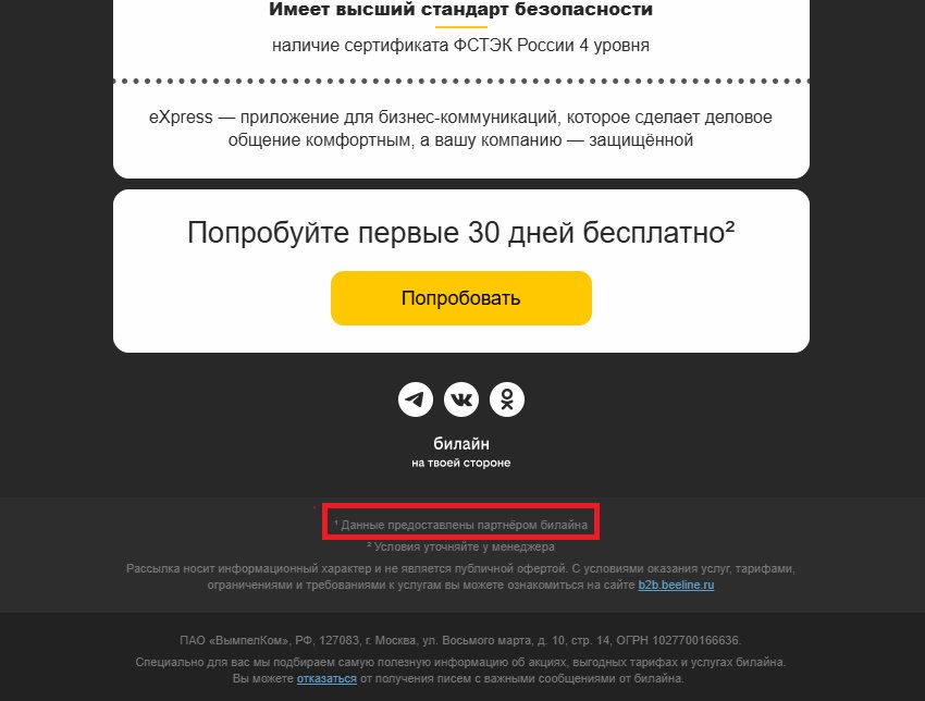 Билайн занимается мерзким спамом, прикрываясь тем, что «данные предоставлены партнёром билайна». Я считаю, что у спамеров покупать ничего нельзя из принципа, так как это паразиты. ⬇