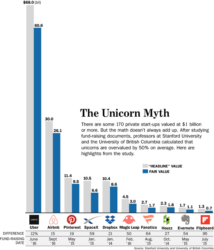 Стребулаев и Уилл Горналл (Will Gornal) заключают, что единороги в среднем на 50% (на столько объявляемая стоимость компаний выше, чем справедливая).