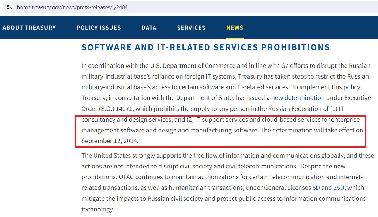 С 12 сентября 2024 года, напомню, вступает в силу американский запрет на поставку «любому лицу в РФ» (1) услуг ИТ-консалтинга и проектирования и (2) услуг ИТ-поддержки и облачных услуг для управления предприятием, а также программного обеспечения для проектирования и производства.