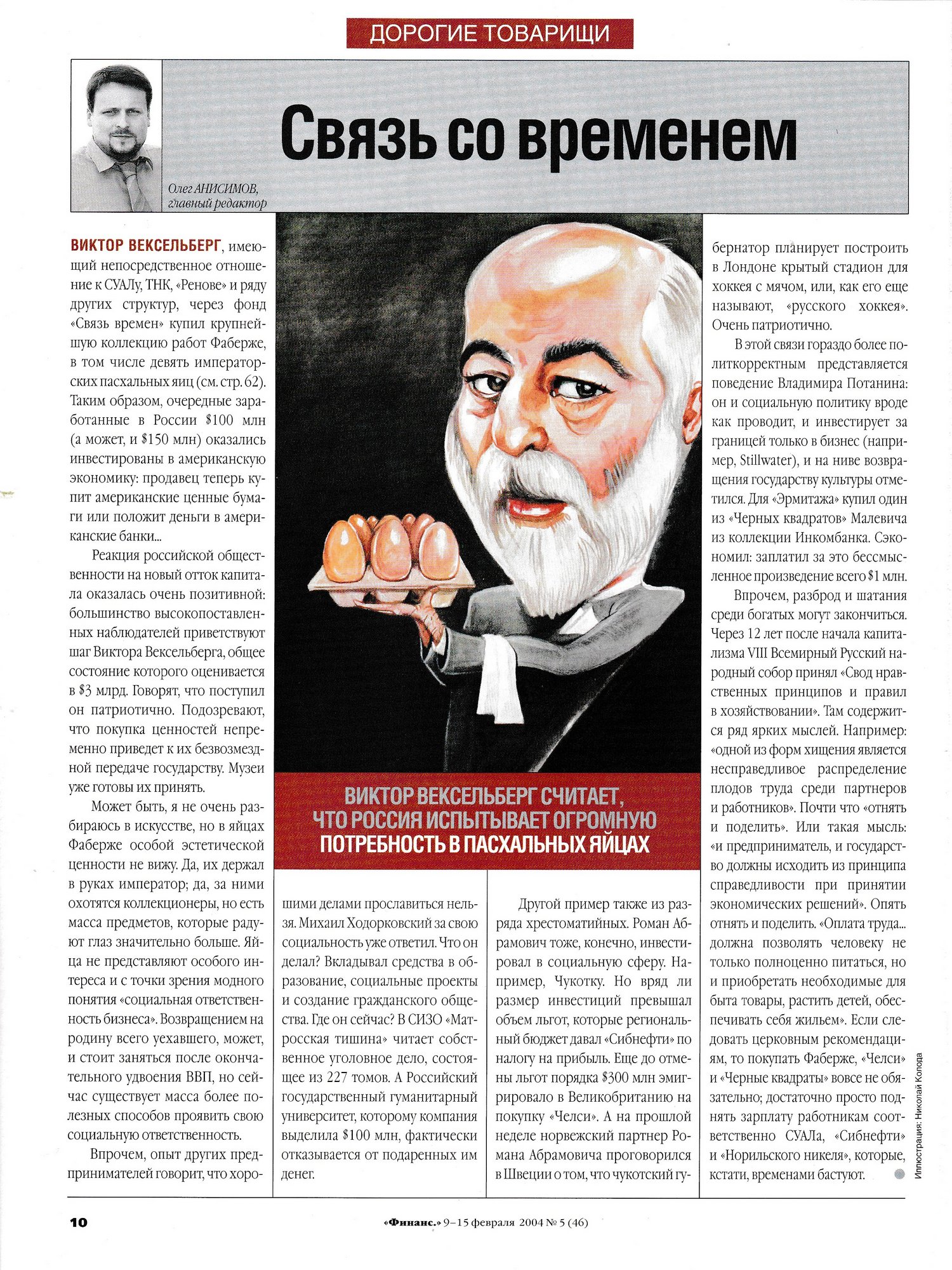 ВИКТОР ВЕКСЕЛЬБЕРГ, имеющий непосредственное отношение к СУАЛу, ТНК, «Ренове» и ряду других структур, через фонд «Связь времен» купил крупнейшую коллекцию работ Фаберже, в том числе девять императорских пасхальных яиц (см. стр. 62). Таким образом, очередные заработанные в России $100 млн (а может, и $150 млн) оказались инвестированы в американскую экономику: продавец теперь купит американские ценные бумаги или положит деньги в американские банки…