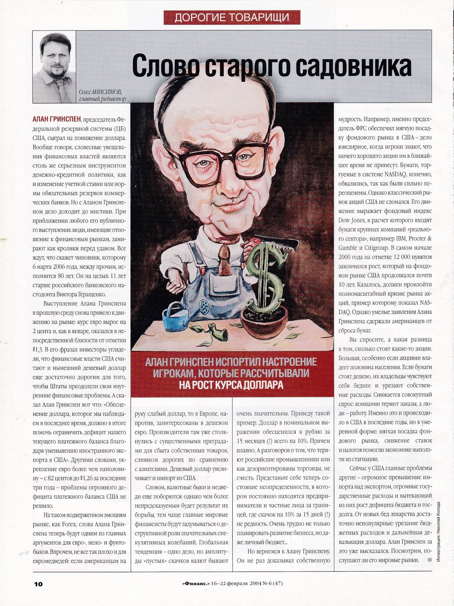 АЛАН ГРИНСПЕН, председатель Федеральной резервной системы (ЦБ) США, сыграл на понижение доллара. Вообще говоря, словесные увещевания финансовых властей являются столь же серьезным инструментом денежно-кредитной политики, как и изменение учетной ставки или нормы обязательных резервов коммерческих банков. Но с Аланом Гринспеном дело доходит до мистики. При приближении любого его публичного выступления люди, имеющие отношение к финансовым рынкам, замирают как кролики перед удавом. Все ждут, что скажет чиновник, которому 6 марта 2006 года, между прочим, исполнится 80 лет. Он на целых 11 лет старше российского банковского мастодонта Виктора Геращенко.