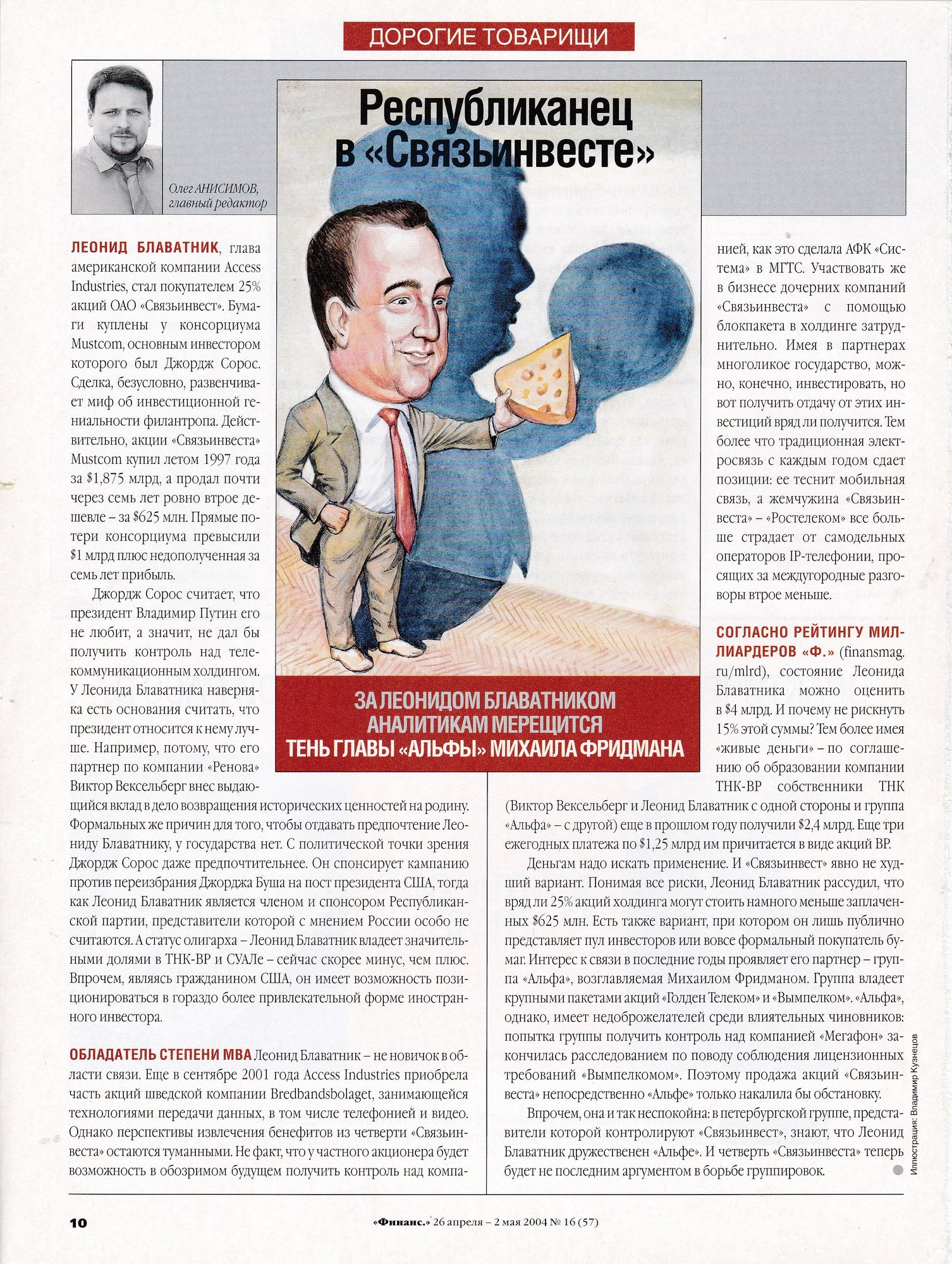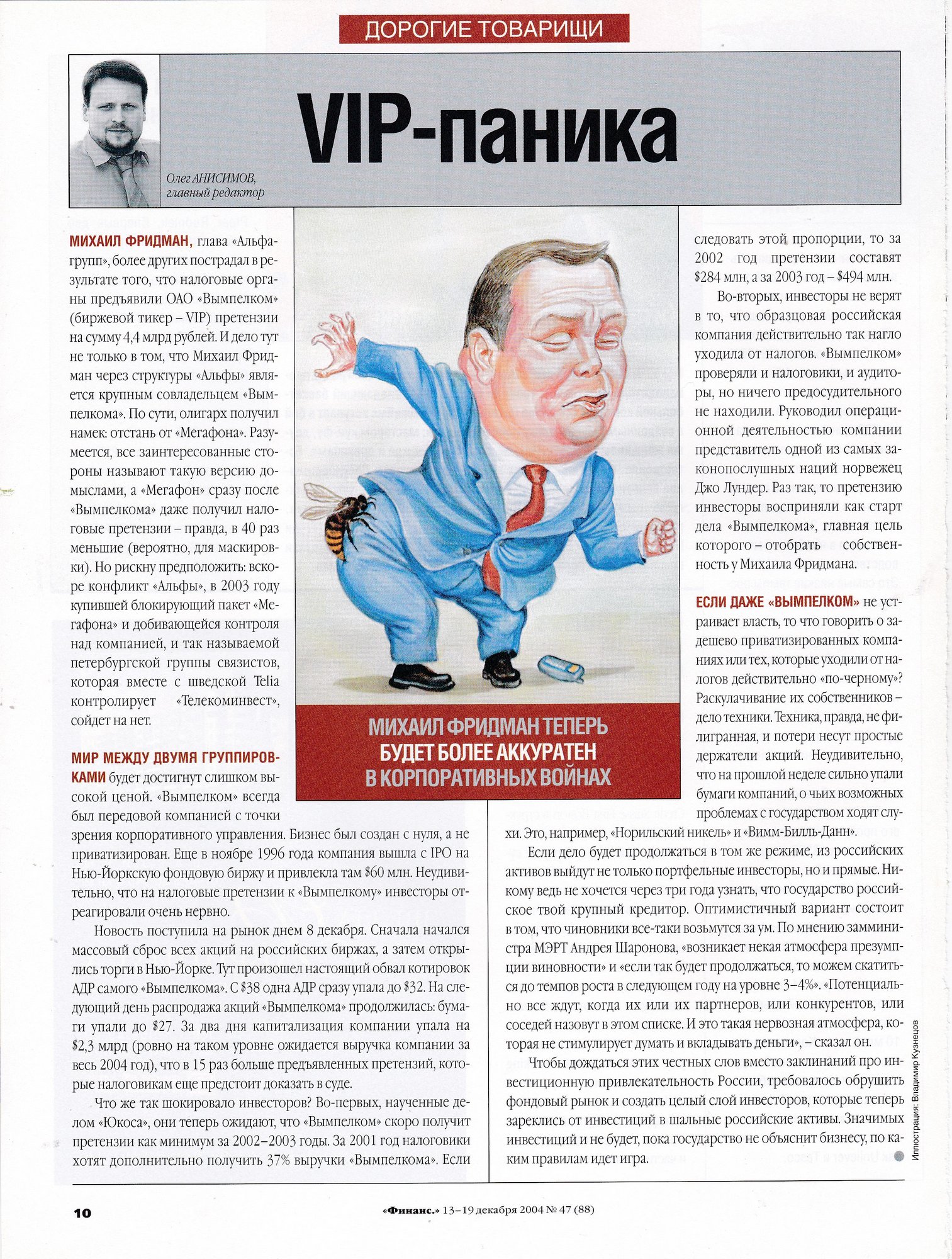МИХАИЛ ФРИДМАН, глава «Альфа-групп», более других пострадал в результате того, что налоговые органы предъявили ОАО «Вымпелком» (биржевой тикер — VIP) претензии на сумму 4,4 млрд рублей. И дело тут не только в том, что Михаил Фридман через структуры «Альфы» является крупным совладельцем «Вымпелкома». По сути, олигарх получил намек: отстань от «Мегафона». Разумеется, все заинтересованные стороны называют такую версию домыслами, а «Мегафон» сразу после «Вымпелкома» даже получил налоговые претензии — правда, в 40 раз меньшие (вероятно, для маскировки). Но рискну предположить: вскоре конфликт «Альфы», в 2003 году купившей блокирующий пакет «Мегафона» и добивающейся контроля над компанией, и так называемой петербургской группы связистов, которая вместе с шведской Telia контролирует «Телекоминвест», сойдет на нет.