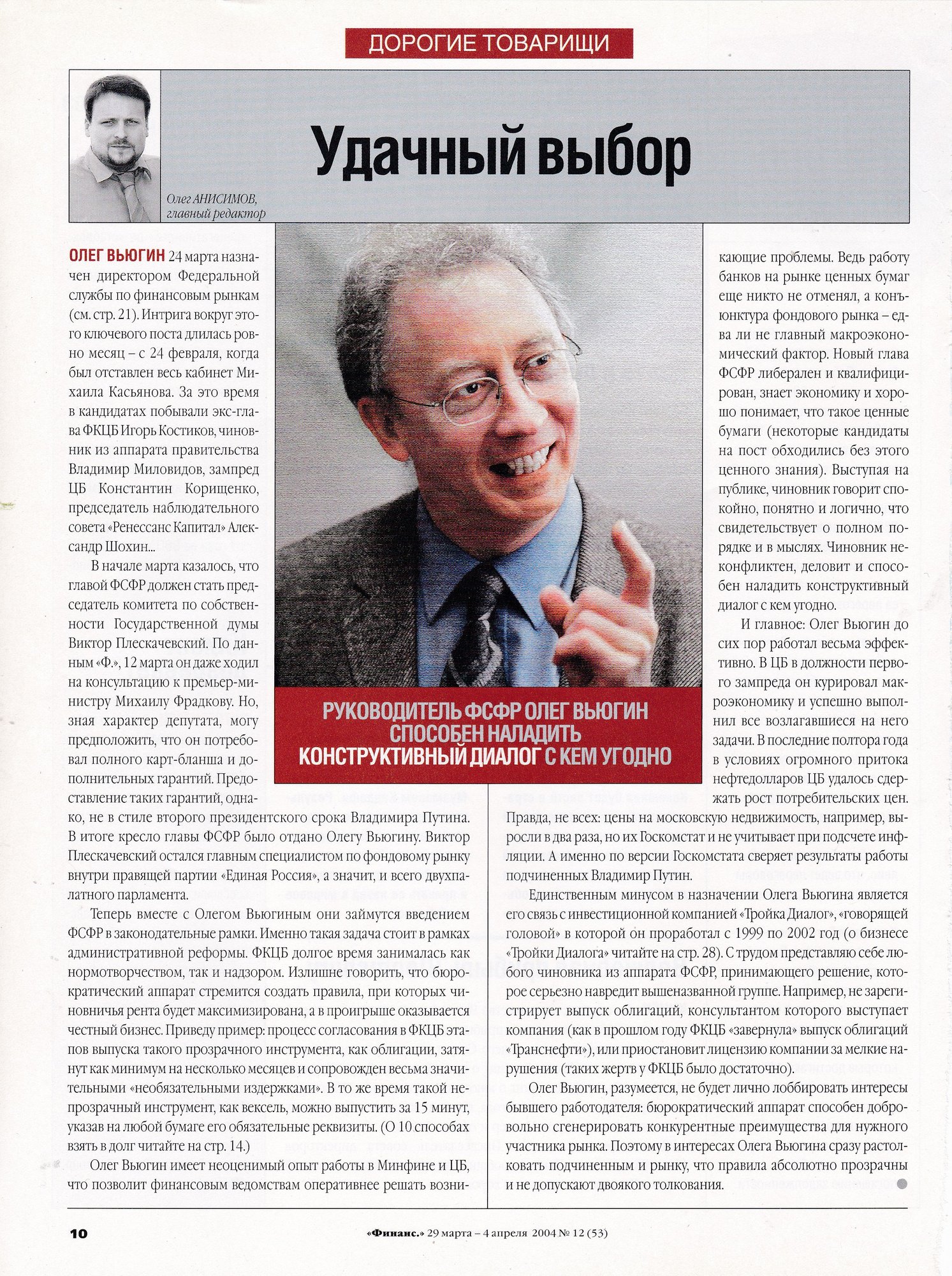 Назначение Олега Вьюгина было весьма позитивно воспринято профессиональным сообществом по двум причинам: он интеллектуал и не имел собственного бизнеса в подконтрольной сфере, как его предшественник — председатель ФКЦБ Игорь Костиков. Всю весну и лето оптимизм нарастал: публичные заявления главы ФСФР не оставляли сомнений в том, что ситуация на фондовом рынке изменится к лучшему.