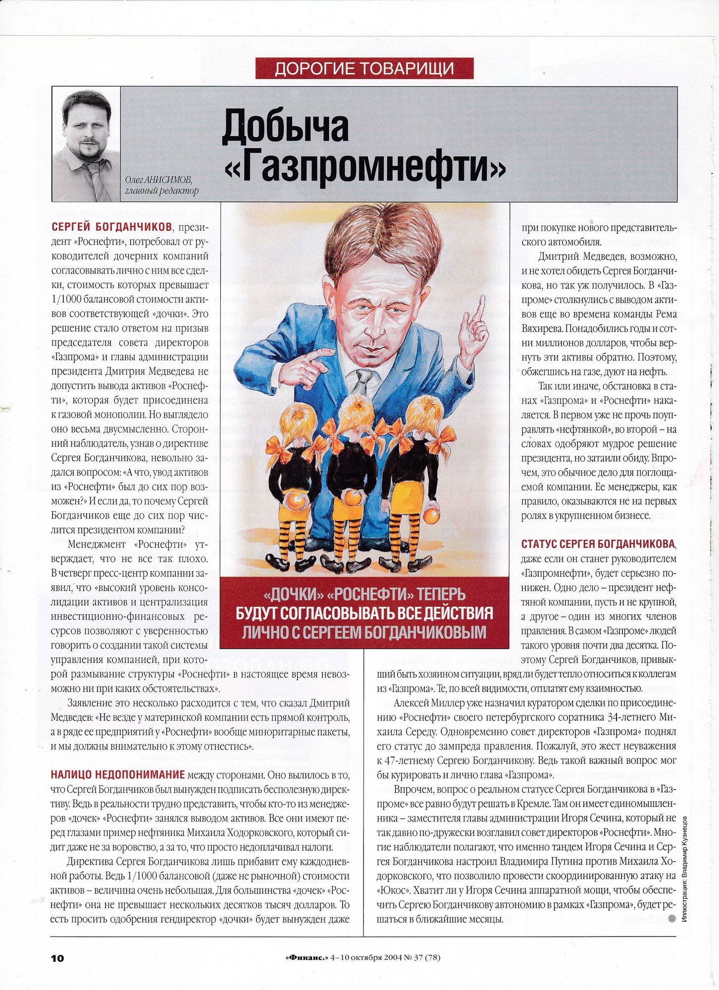 СЕРГЕЙ БОГДАНЧИКОВ, президент «Роснефти», потребовал от руководителей дочерних компаний согласовывать лично с ним все сделки, стоимость которых превышает 1/1000 балансовой стоимости активов соответствующей «дочки». Это решение стало ответом на призыв председателя совета директоров «Газпрома» и главы администрации президента Дмитрия Медведева не допустить вывода активов «Роснефти», которая будет присоединена к газовой монополии. Но выглядело оно весьма двусмысленно. Сторонний наблюдатель, узнав о директиве Сергея Богданчикова, невольно задался вопросом: «А что, увод активов из «Роснефти» был до сих пор возможен?» И если да, то почему Сергей Богданчиков еще до сих пор числится президентом компании?
