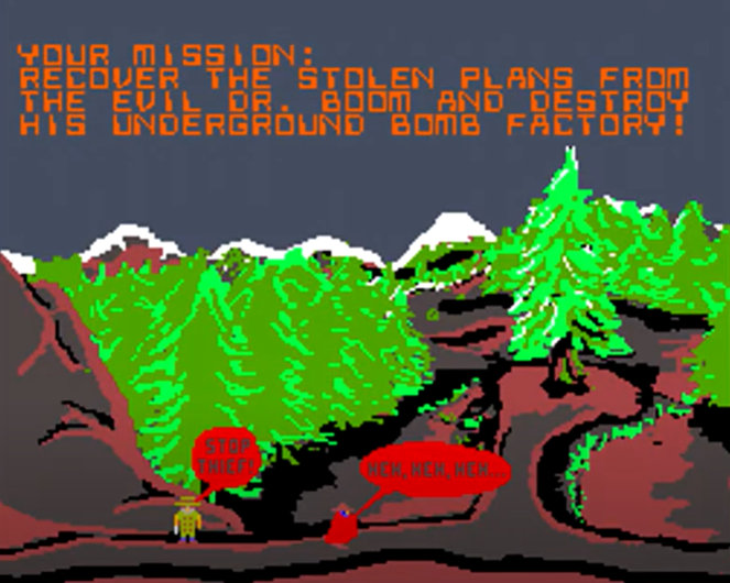 Ваша миссия: верни украденные злодеем Доктором Бумом чертежи и разрушь его подземную фабрику бомб! (Your mission: recover the stolen plans from the evil Dr. Boom and destroy his underground bomb factory!)