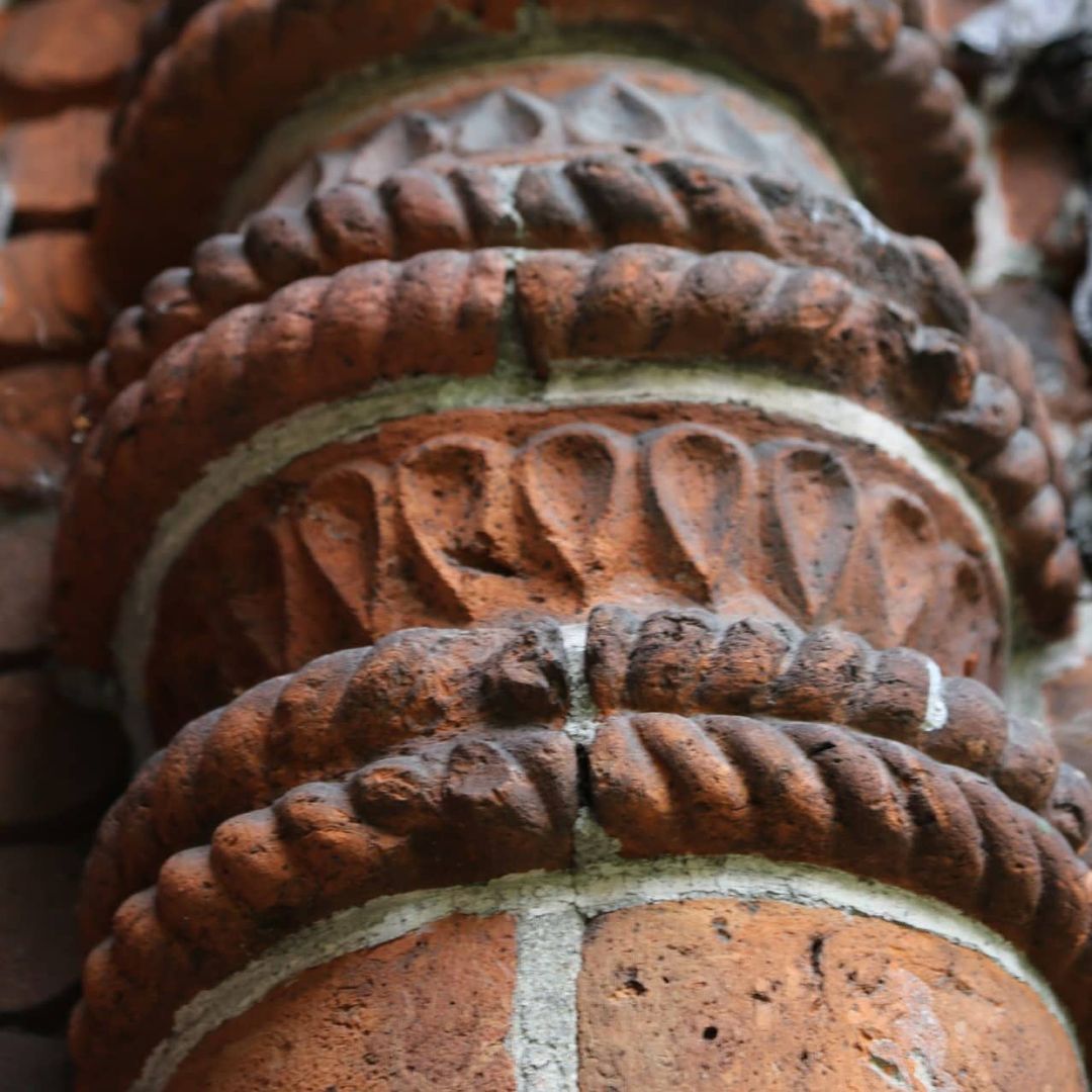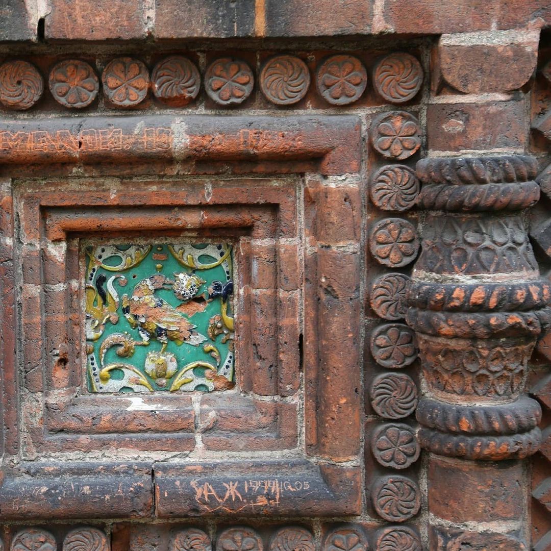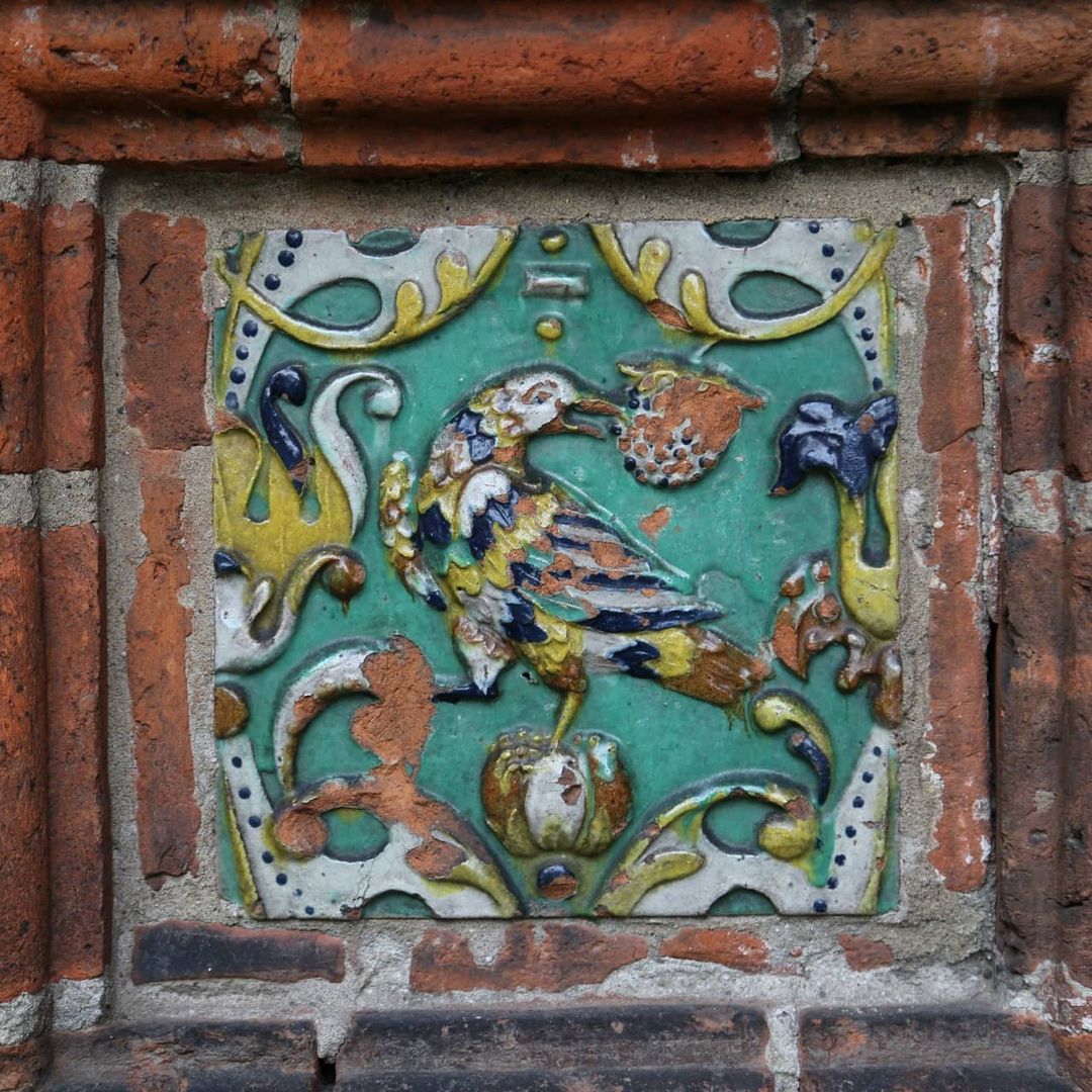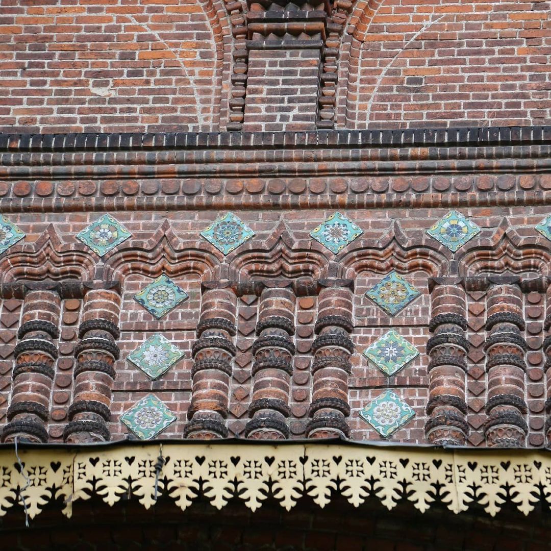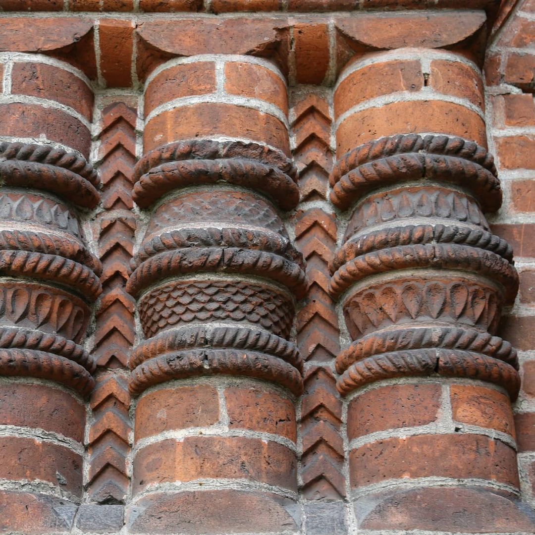 Разнообразие его форм огромно — от скромных профилей до целых фигурных плит: это разнообразные бусины, розетки, валики, косички, колонки разных размеров и форм, дыньки, кокошники и т. д. Эта изощренная каменная краснокирпичная «резьба» прекрасно сочетается с цветными изразцами.