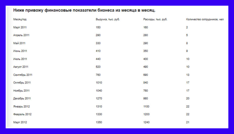 Ниже привожу финансовые показатели бизнеса из месяца в месяц.