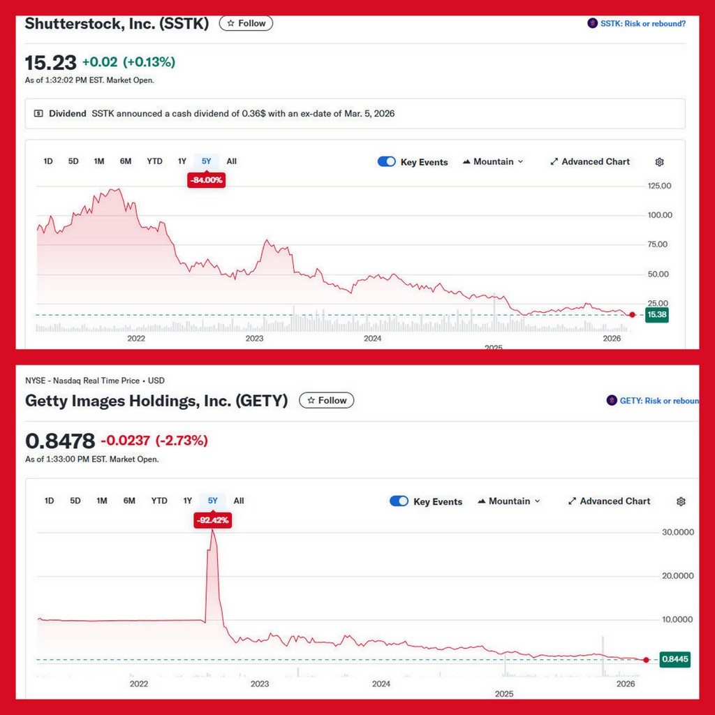 ИИ убивает сектор продажи иллюстраций, сообщает Финсайд. Акции Getty Images стоят в 30 раз меньше своих максимумов 2022 года, а бумаги Shutterstock — в 8 раз, будто это не доли в компаниях с выручкой под миллиард долларов в год, а альткойны без рода и племени.